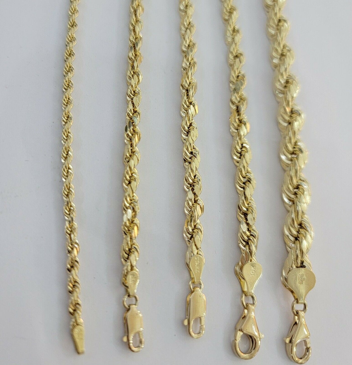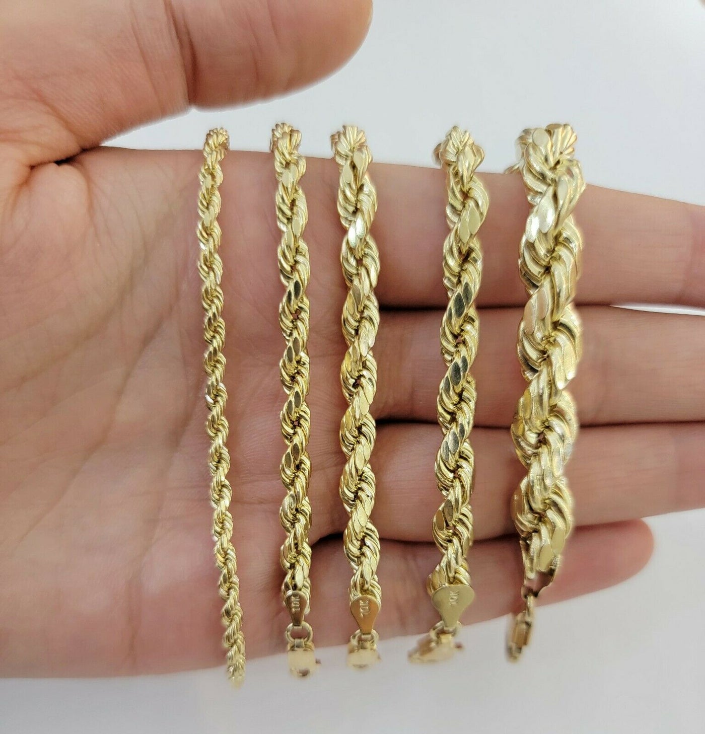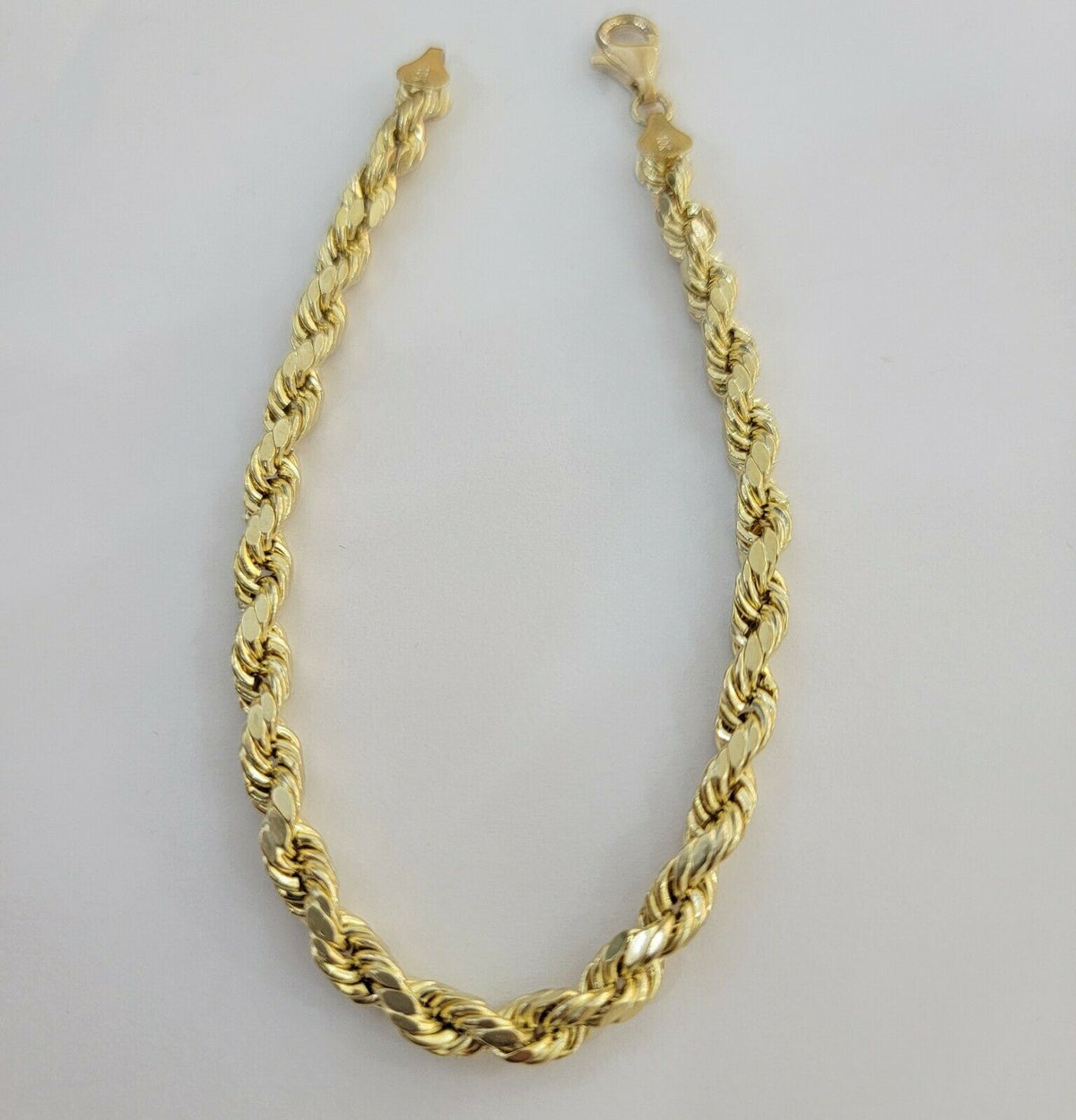 Real 10 k Yellow Gold Rope bracelet. The Width of the bracelet is 3 MM , 4 MM , 5 MM , 6 MM , 7 MM , 8 MM and Various Length stating From 7 Inches - 9 Inches. The bracelet is all the way Real. The bracelet is beautiful and has excellent Diamond Cuts. The Clasp is lobster. Contact us for more information..