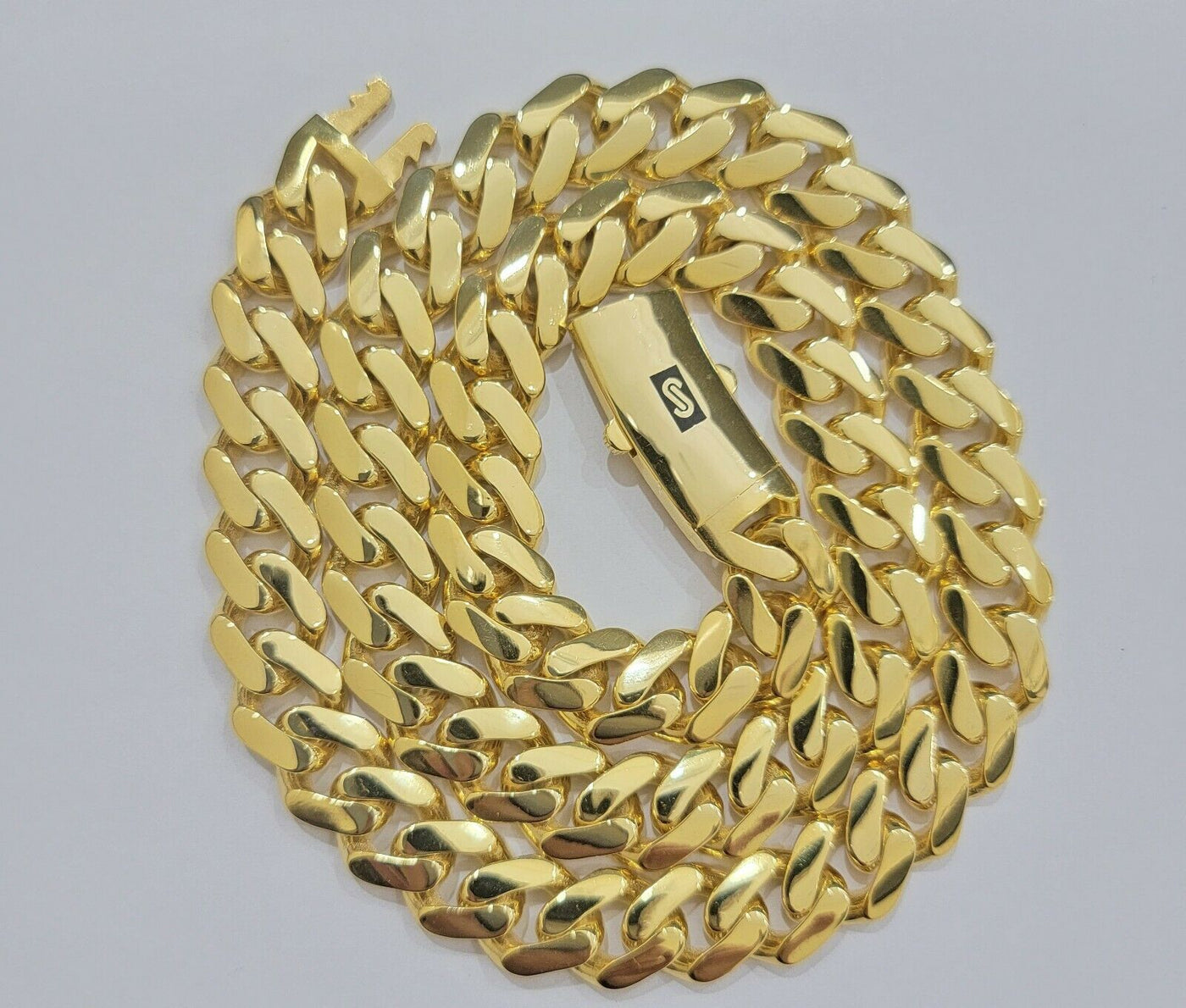 10 k Yellow Gold ( Real , Not plated , Not filled ) Royal Cuban link Monaco Bracelet, For men's . The Width of the Bracelet is 13 MM and 8 Inches Long. The Clasp is Box Lock. The Bracelet is considered durable. The Bracelet is 100% guaranteed 10k yellow gold and have been professionally tested and stamped 10k for purity authenticity. The Bracelet feels light weight because of its weight but We guarantee the purity of the gold to be 10k, and the Bracelet are NOT GOLD PLATED, NOT FILLED. If you are not happy with the way it looks or feels, we do offer FREE Return shipping.