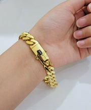 10 k Yellow Gold ( Real , Not plated , Not filled ) Royal Cuban link Monaco Bracelet, For men's . The Width of the Bracelet is 13 MM and 9 Inches Long. The Clasp is Box Lock. The Bracelet is considered durable. The Bracelet is 100% guaranteed 10k yellow gold and have been professionally tested and stamped 10k for purity authenticity. The Bracelet feels light weight because of its weight but We guarantee the purity of the gold to be 10k, and the Bracelet are NOT GOLD PLATED, NOT FILLED. If you are not happy with the way it looks or feels, we do offer FREE Return shipping.