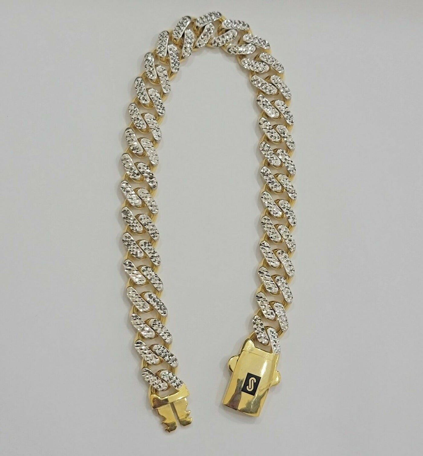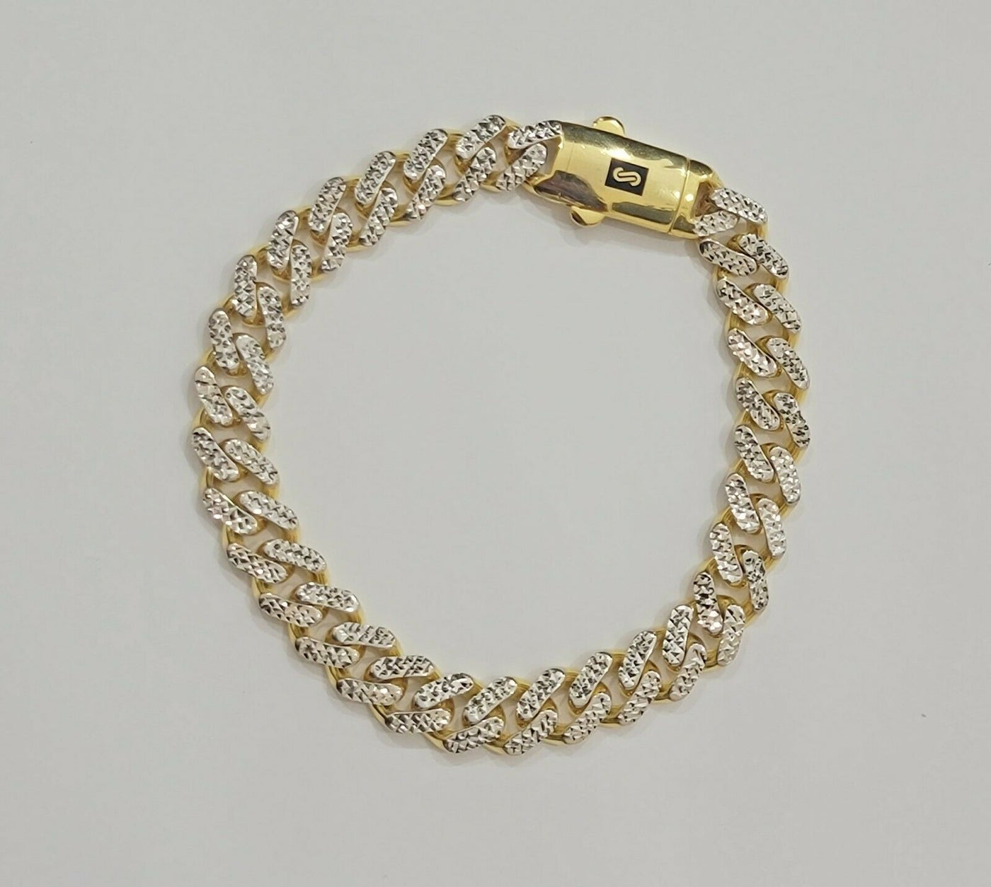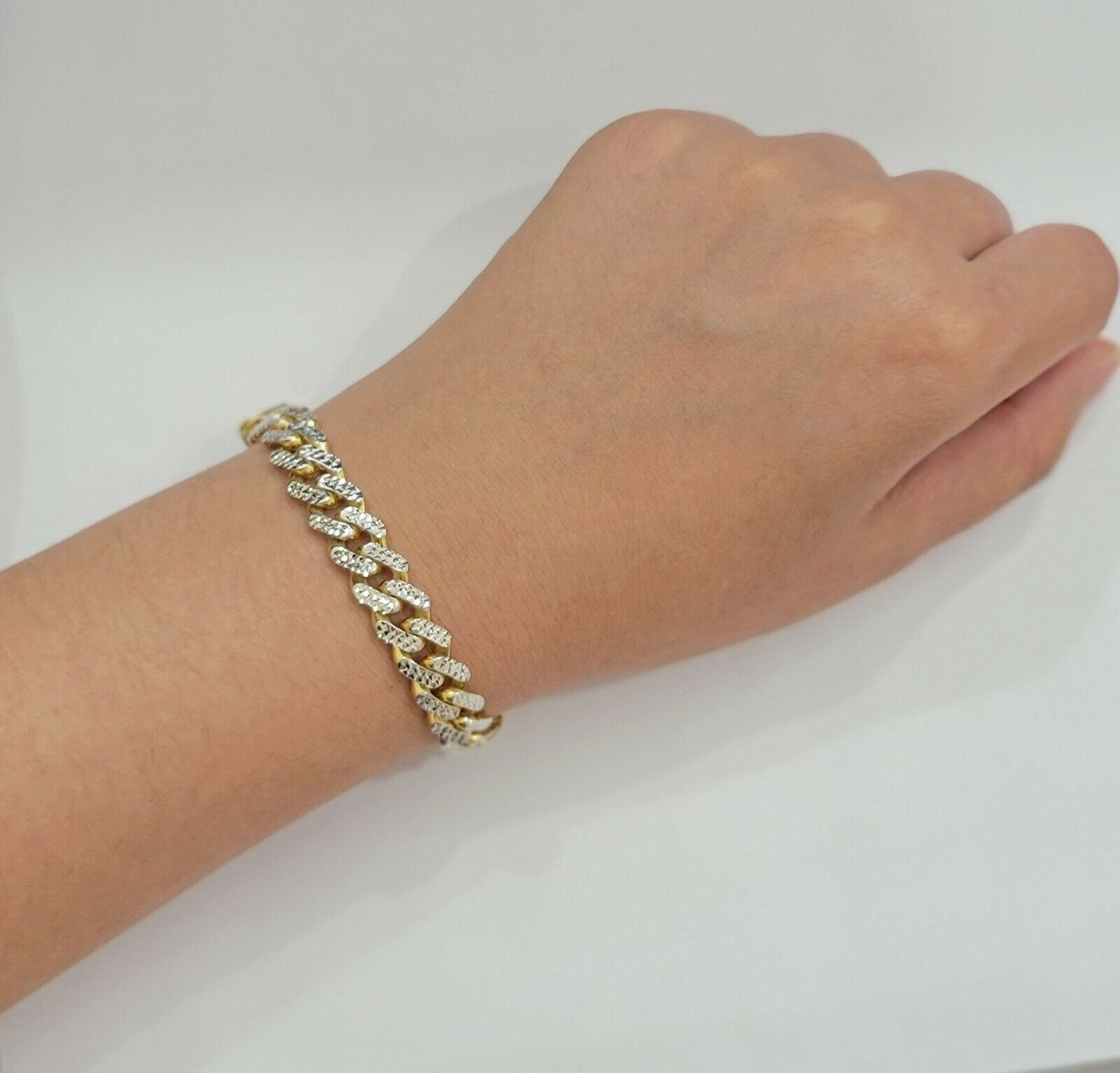 10 k Yellow Gold ( Real , Not plated , Not filled ) Monaco link bracelet, rhodium Diamond Cuts For men's . The Width of the bracelet is 9 MM and 8 Inch Long. The Clasp is Box Lock. The bracelet is considered durable. The bracelet is 100% guaranteed 10k yellow gold and have been professionally tested and stamped 10k for purity authenticity. The chain feels light weight because of its make being hollow but We guarantee the purity of the gold to be 10k, and the chains are NOT GOLD PLATED, NOT FILLED. If you are not happy with the way it looks or feels, we do offer FREE Return shipping.