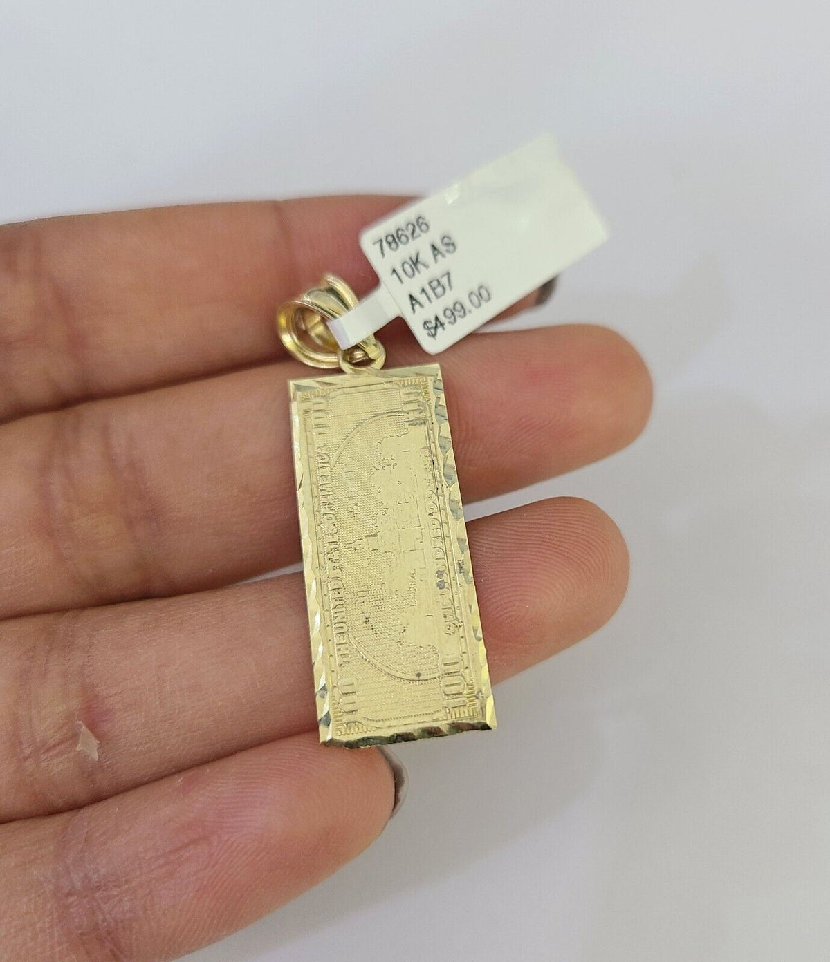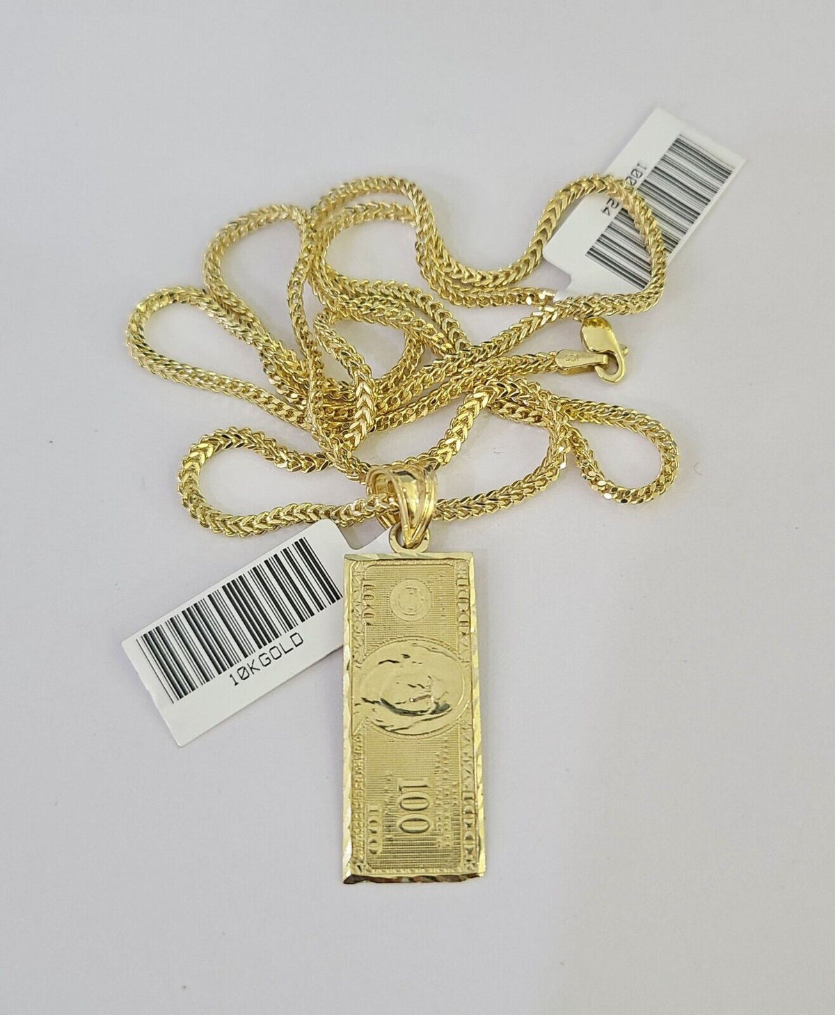 Is Presenting You with This Absolutely Stunning Real 10k Yellow Gold Franco Chain 2mm, 16-24 Inches Lobster Lock with 100 Money Dollar Pendant. The links are 10K GOLD and are very strong. 22"A3B8 A1B7 AS