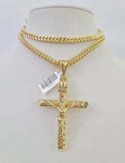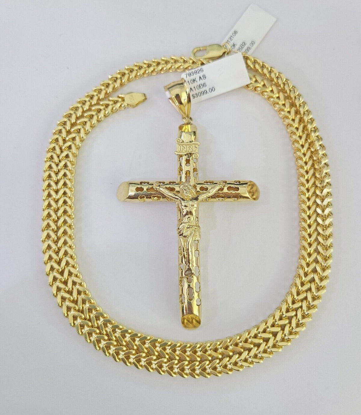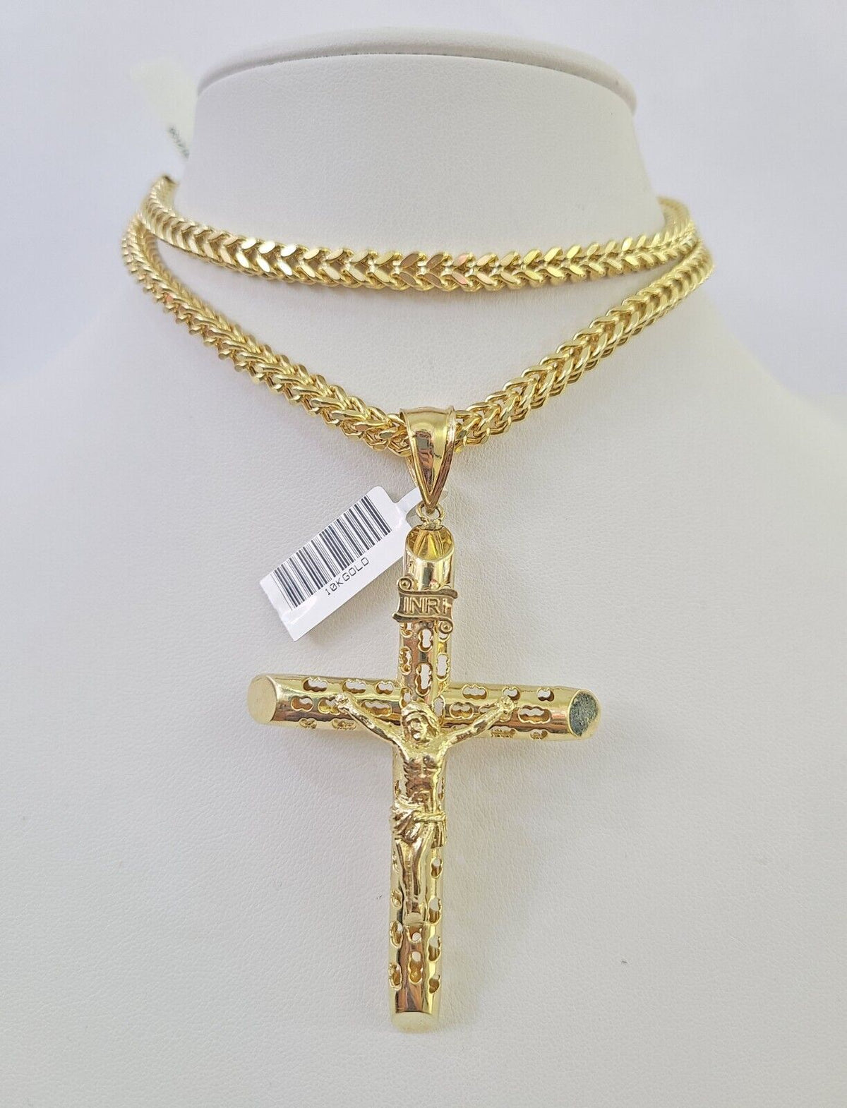Is Presenting You with This Absolutely Stunning Real 10k Yellow Gold Franco Chain 5mm, 20-26 Inches Lobster Lock with INRI Jesus Cross Pendant. The links are 10K GOLD and are very strong. 24"A25B2 A10B6 AS