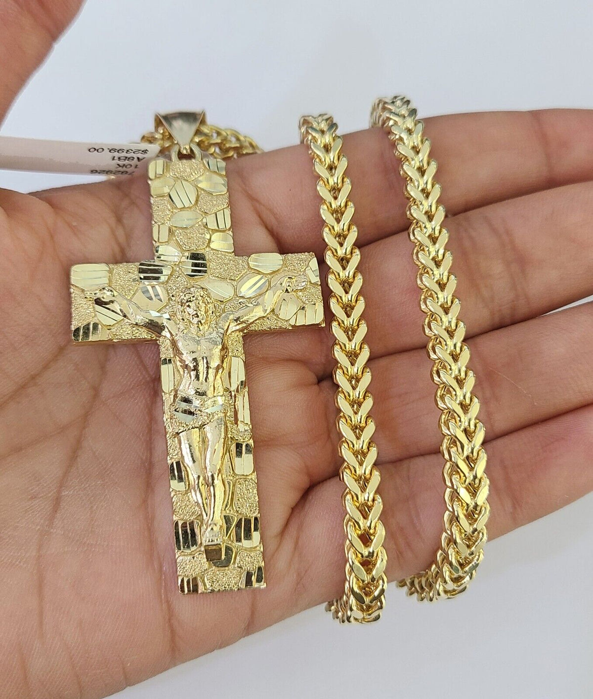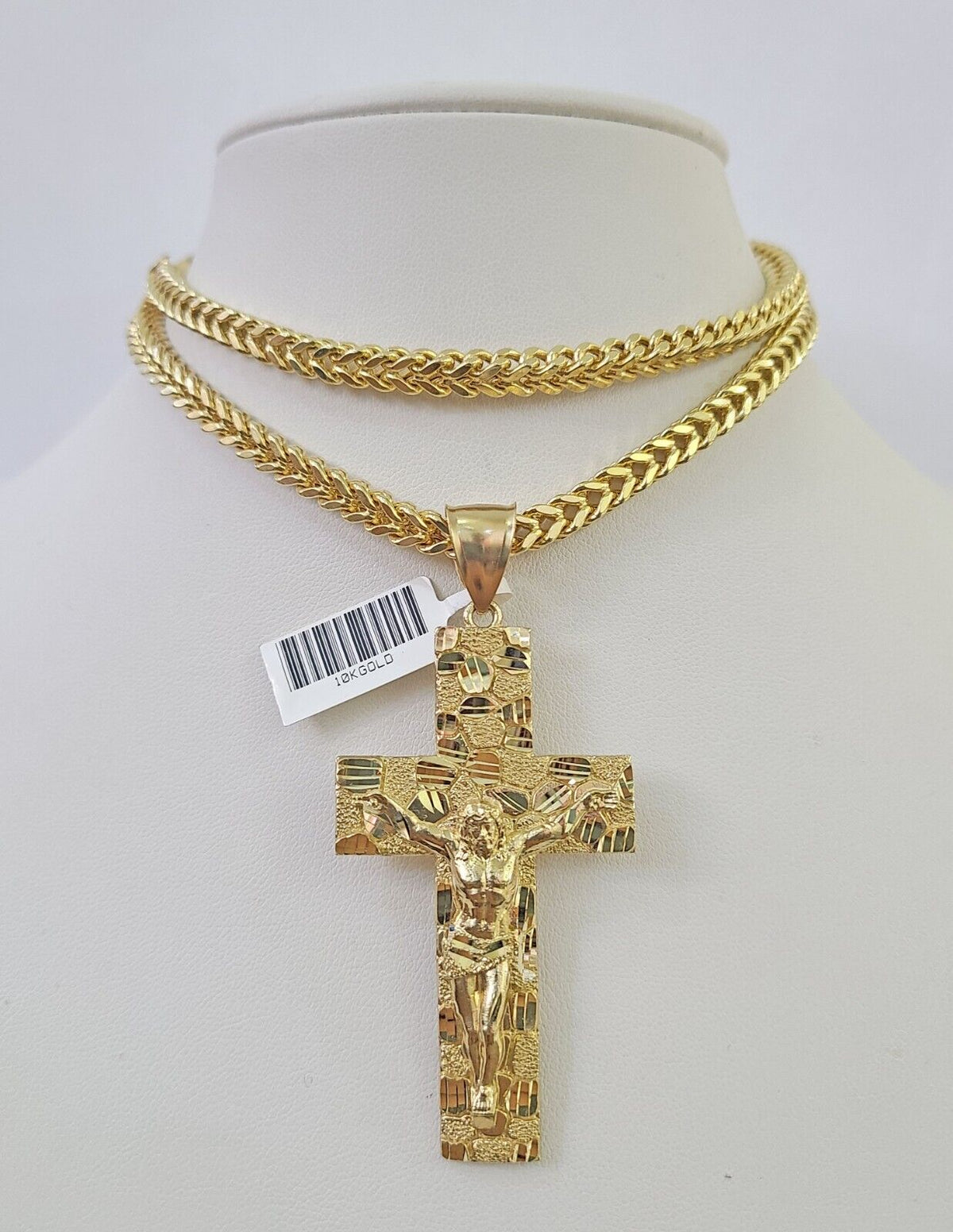 Is Presenting You with This Absolutely Stunning Real 10k Yellow Gold Franco Chain 5mm, 20-26 Inches Lobster Lock with Jesus Cross Pendant. The links are 10K GOLD and are very strong. 24"A25B2 A8B1