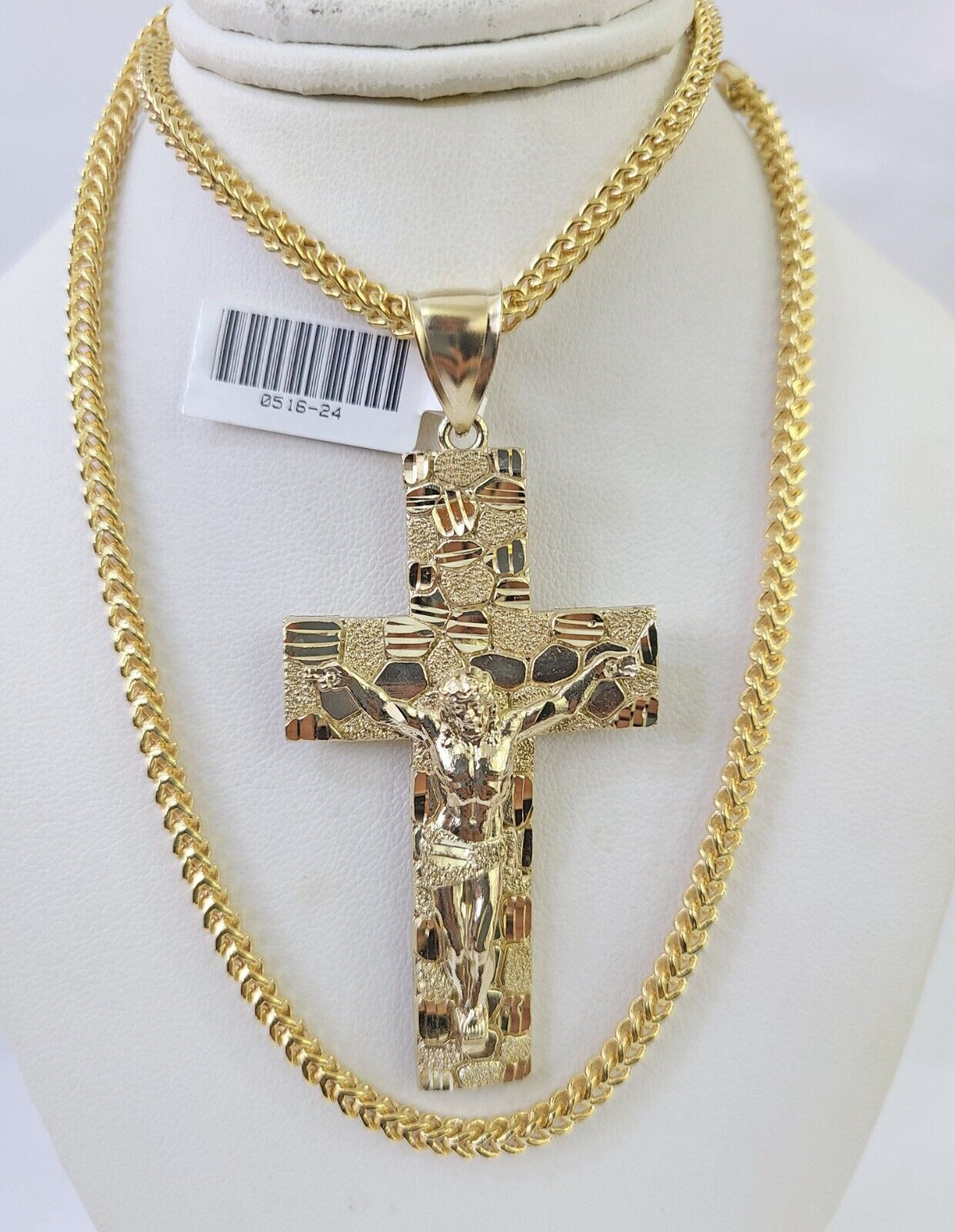 Is Presenting You with This Absolutely Stunning Real 10k Yellow Gold Franco Chain 3mm, 20-26��Inches��Lobster Lock��with Jesus Crucifix Cross Pendant. The links are 10K GOLD and are very strong. 22"A9B5��A8B1