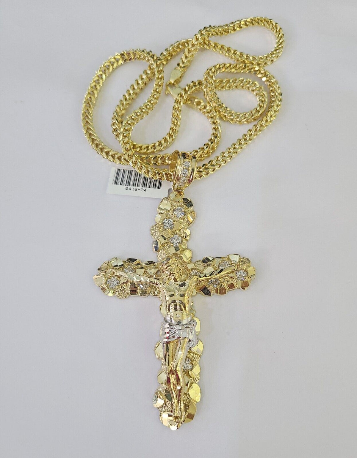 Is Presenting You with This Absolutely Stunning Real 10k Yellow Gold Franco Chain 4mm, 20-28 Inches Lobster Lock with Jesus Crucifix Cross Pendant. The links are 10K GOLD and are very strong. 24"A18B0 A15B9 P8443