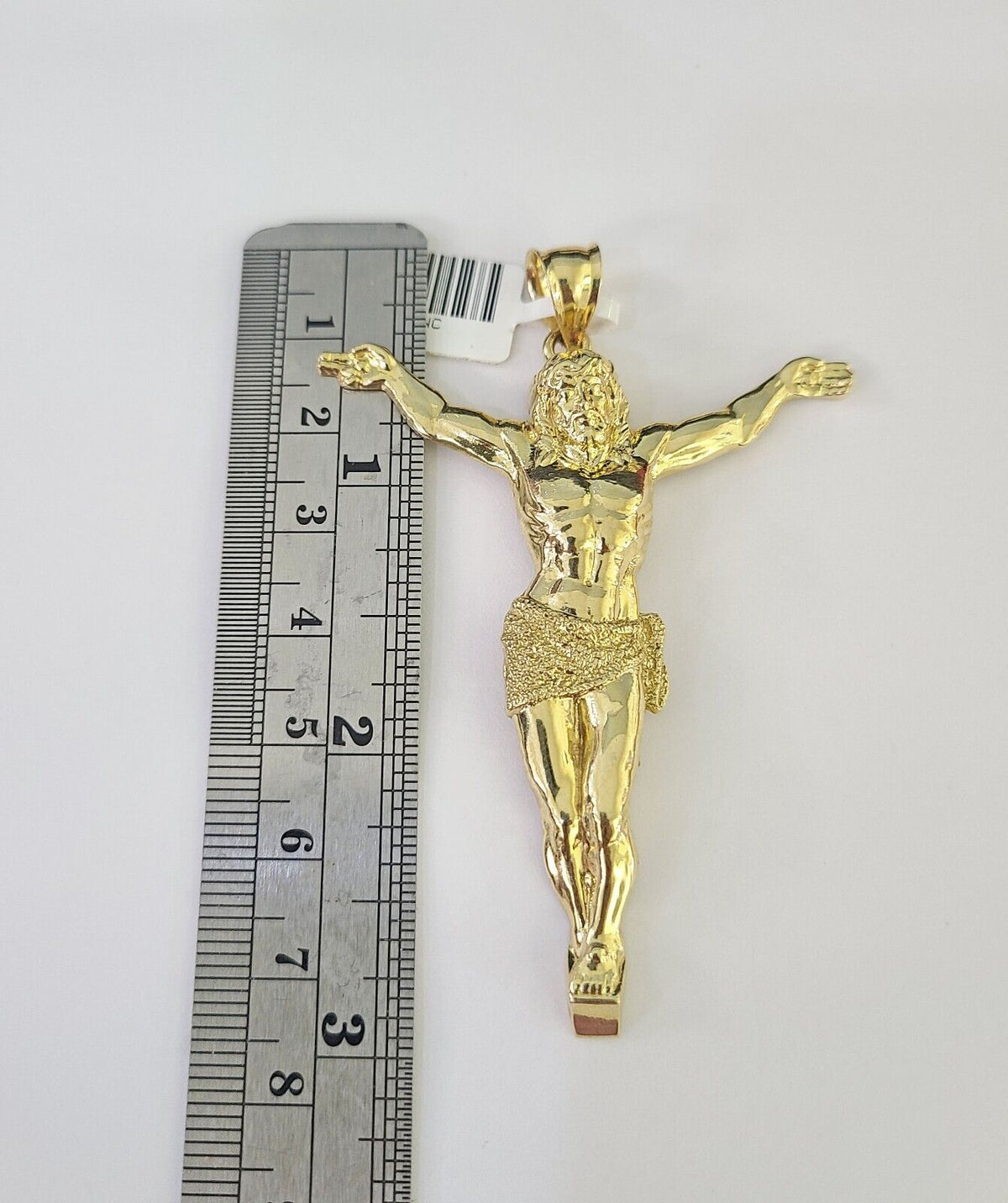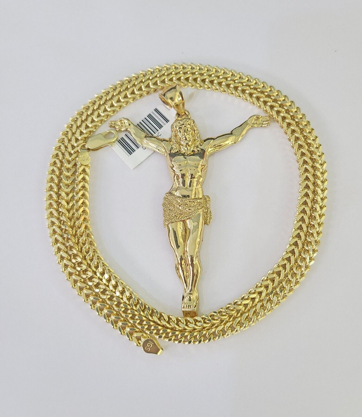 Is Presenting You with This Absolutely Stunning Real 10k Yellow Gold Franco Chain 4mm, 20-28 Inches Lobster Lock with Jesus Crucifix Pendant. The links are 10K GOLD and are very strong. 24"A18B0 A8B6