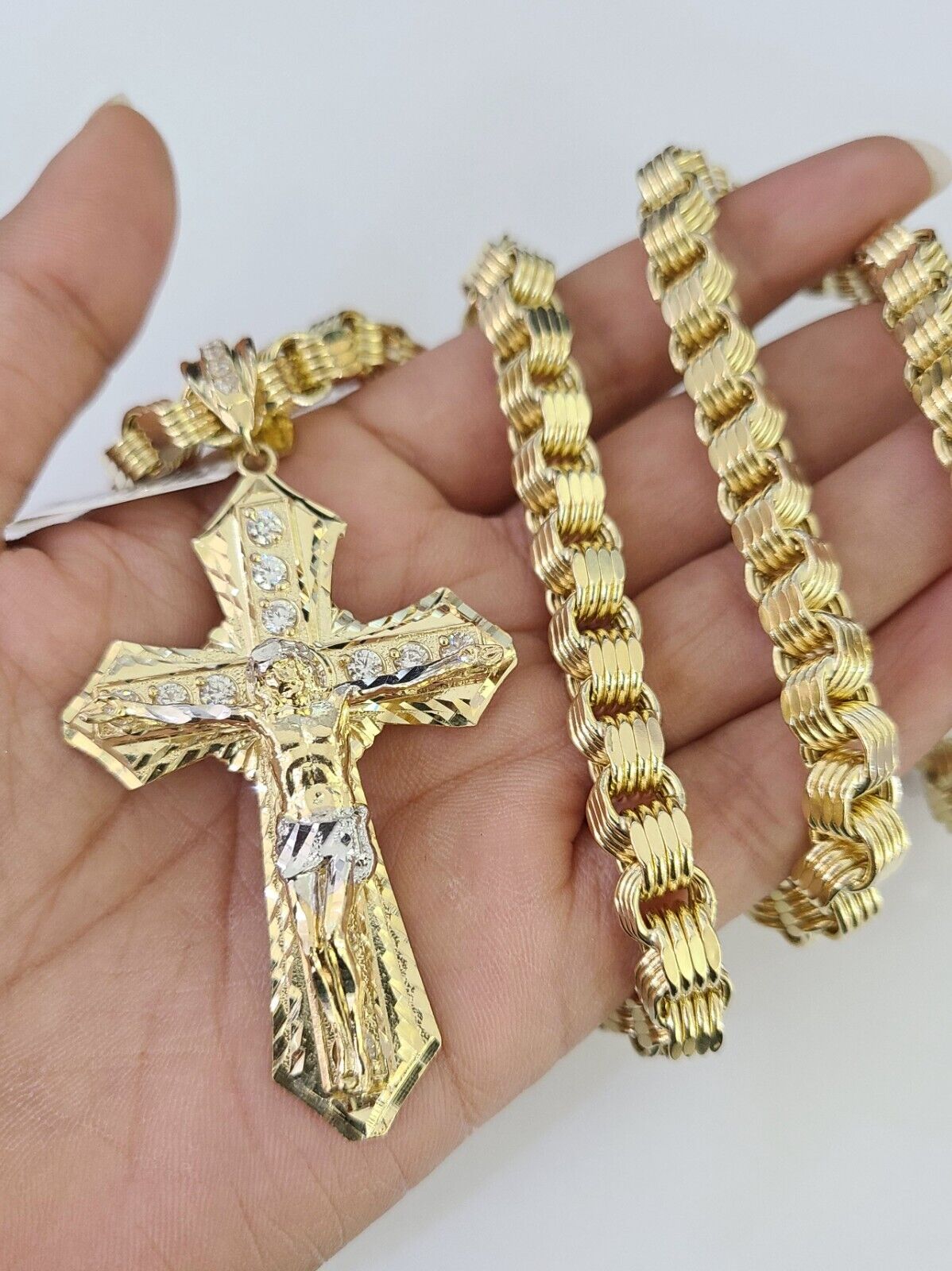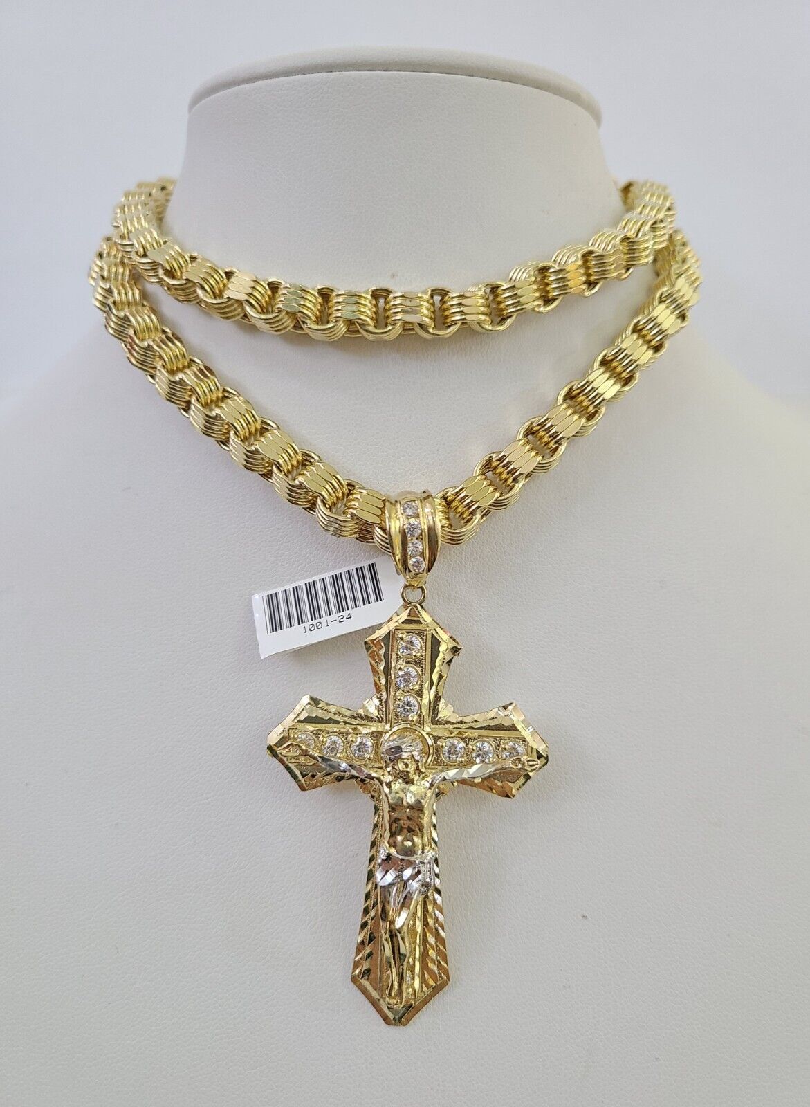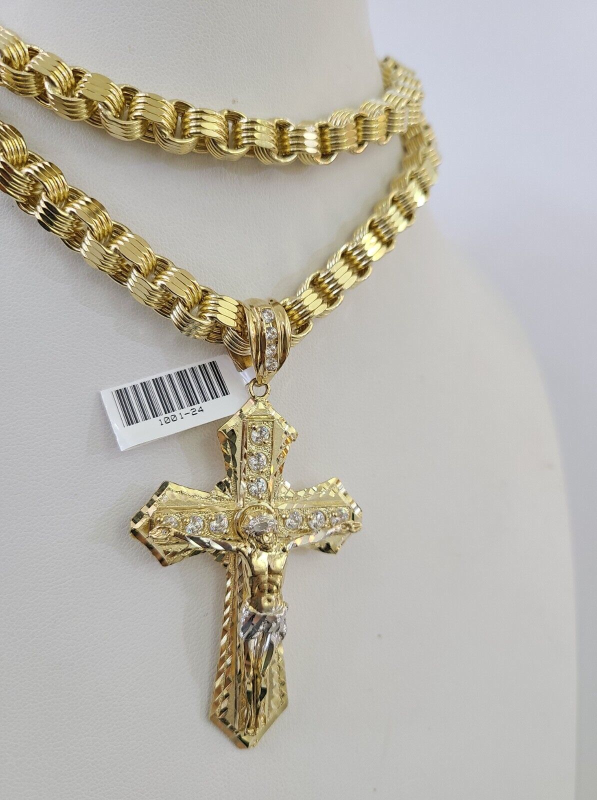 10k Gold Byzantine Chain Necklace Jesus Cross Pendant Charm SET 20"-30" 7.5mm