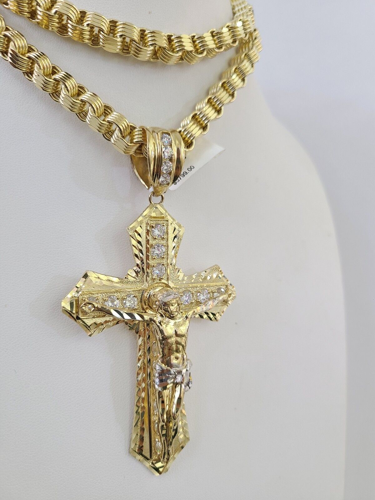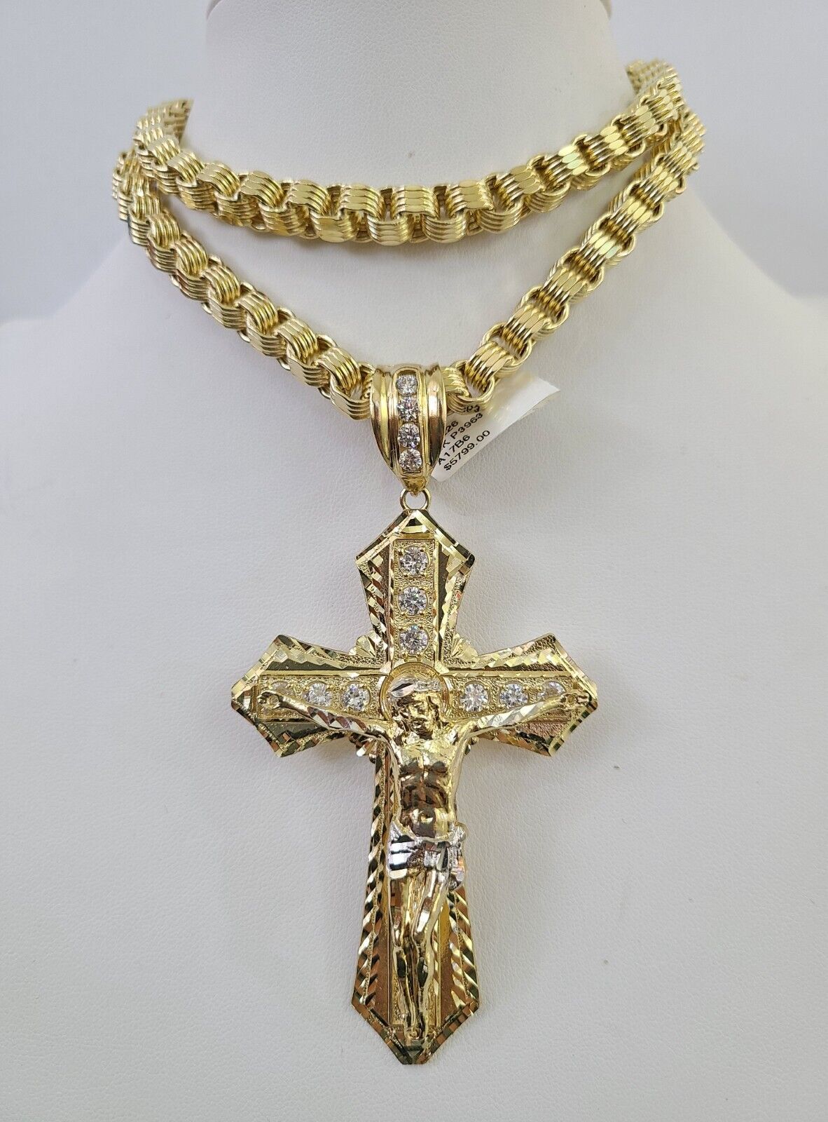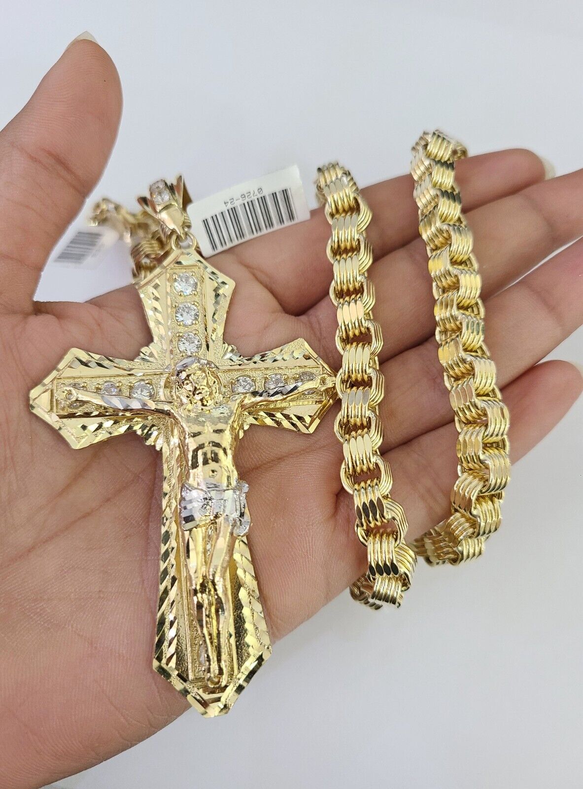 Real 10k Gold Box Byzantine Necklace Jesus Cross Charm Pendant SET Chain 20-30 Inch 7.5 mm