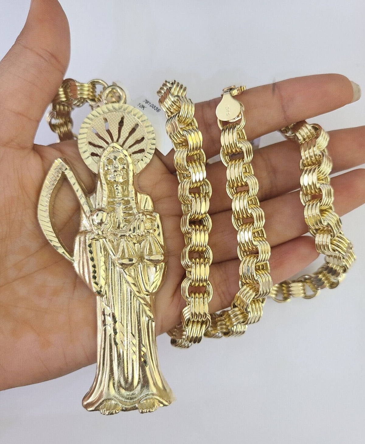 We present You with This Absolutely Stunning Real 10k Yellow Gold Byzantine Chain with Reaper Charm Pendant. It has a detailed cut with a very good finish. These Beautiful Chain and Pendant will not tarnish, discolor, or fade because they are Pure 10K Gold. Please feel free to contact us if you have any queries regarding the item. 26''-A41B5 Cal A25B2
