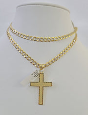 We present You with This Absolutely Stunning Real 10k Yellow Gold SOLID Cuban Curb link Chain Diamond Cut with Jesus Cross Charm. It has a detailed cut with a very good finish. These Beautiful Chains will not tarnish, discolor, or fade because they are Pure 10K Gold. Please feel free to contact us if you have any queries regarding the item. 24"-A12B3 A2B5