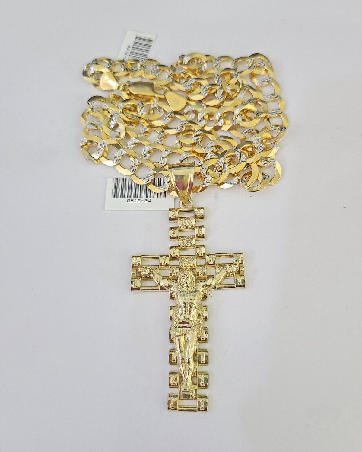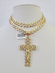We present You with This Absolutely Stunning Real 10k Yellow Gold SOLID Cuban Curb link Chain Diamond Cuts with Jesus Cross Charm. It has a detailed cut with a very good finish. These Beautiful Chains will not tarnish, discolor, or fade because they are Pure 10K Gold. Please feel free to contact us if you have any queries regarding the item. 24"-A35B7 A8B2