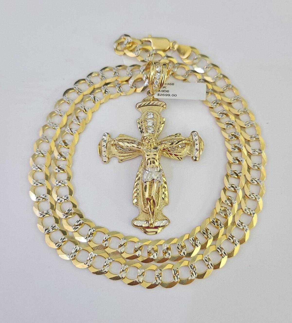 We present You with This Absolutely Stunning Real 10k Yellow Gold SOLID Cuban Curb link Chain Diamond Cuts with Jesus Cross Charm. It has a detailed cut with a very good finish. These Beautiful Chains will not tarnish, discolor, or fade because they are Pure 10K Gold. Please feel free to contact us if you have any queries regarding the item. 24"-A35B7 A9B6