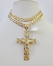 10k Gold Chain Cross Charm Solid Cuban Curb Necklace 9mm 20"-30" Diamond Cut SET