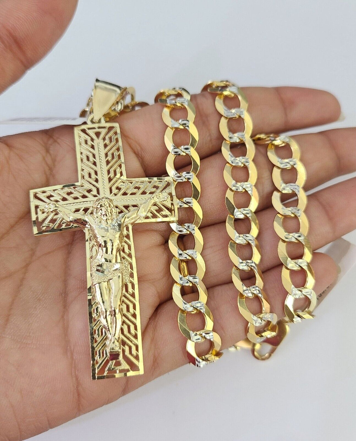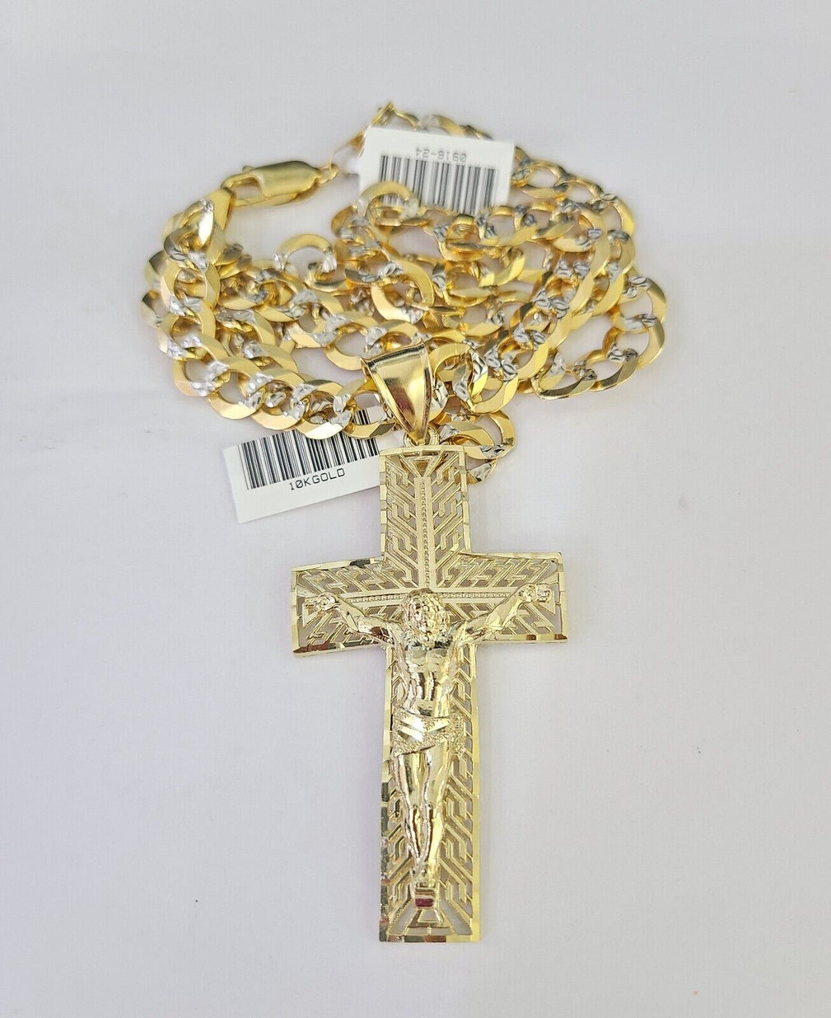 We present You with This Absolutely Stunning Real 10k Yellow Gold SOLID Cuban Curb link Chain Diamond Cuts with Jesus Cross Charm. It has a detailed cut with a very good finish. These Beautiful Chains will not tarnish, discolor, or fade because they are Pure 10K Gold. Please feel free to contact us if you have any queries regarding the item. 24"-A35B7 A6B3
