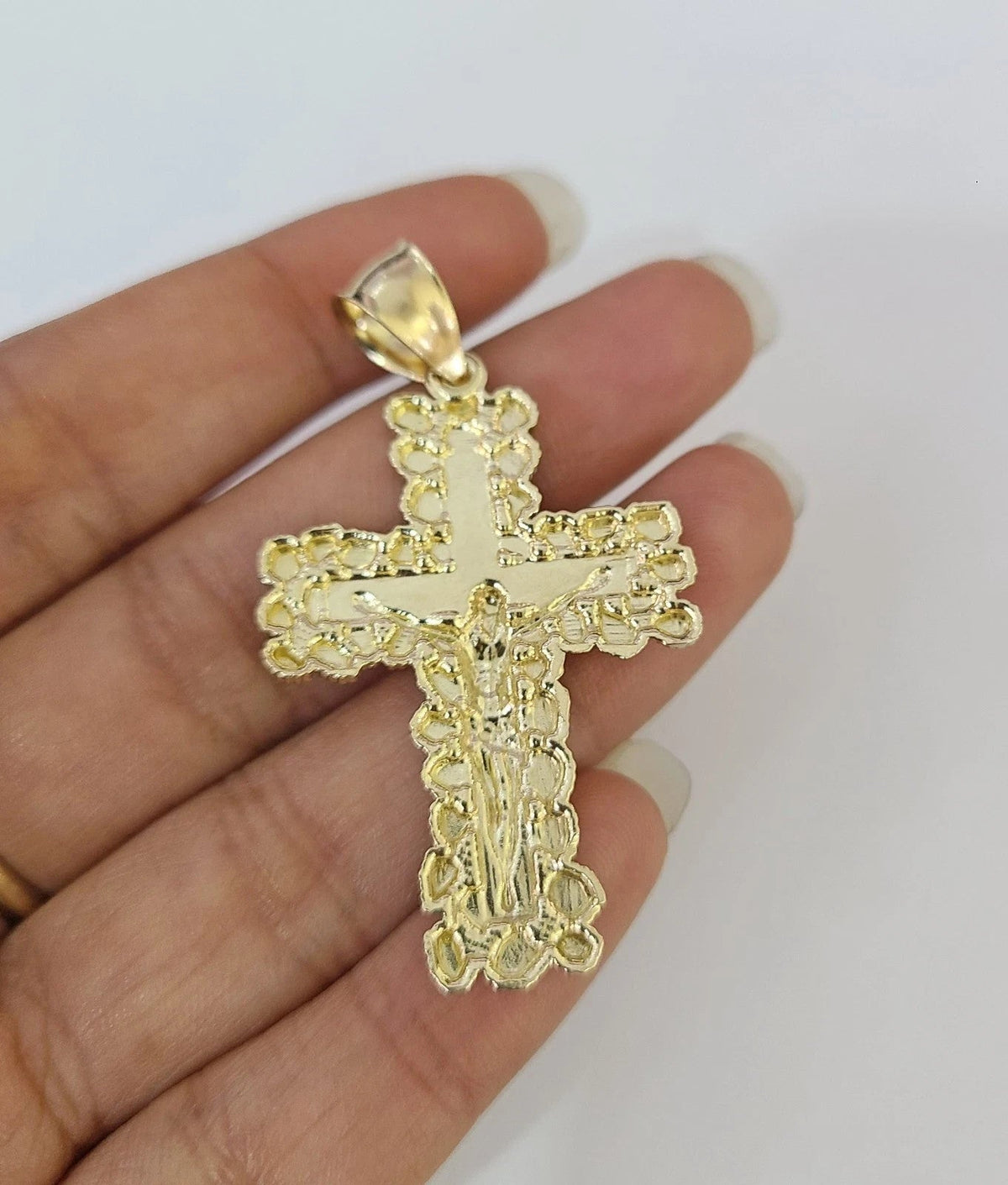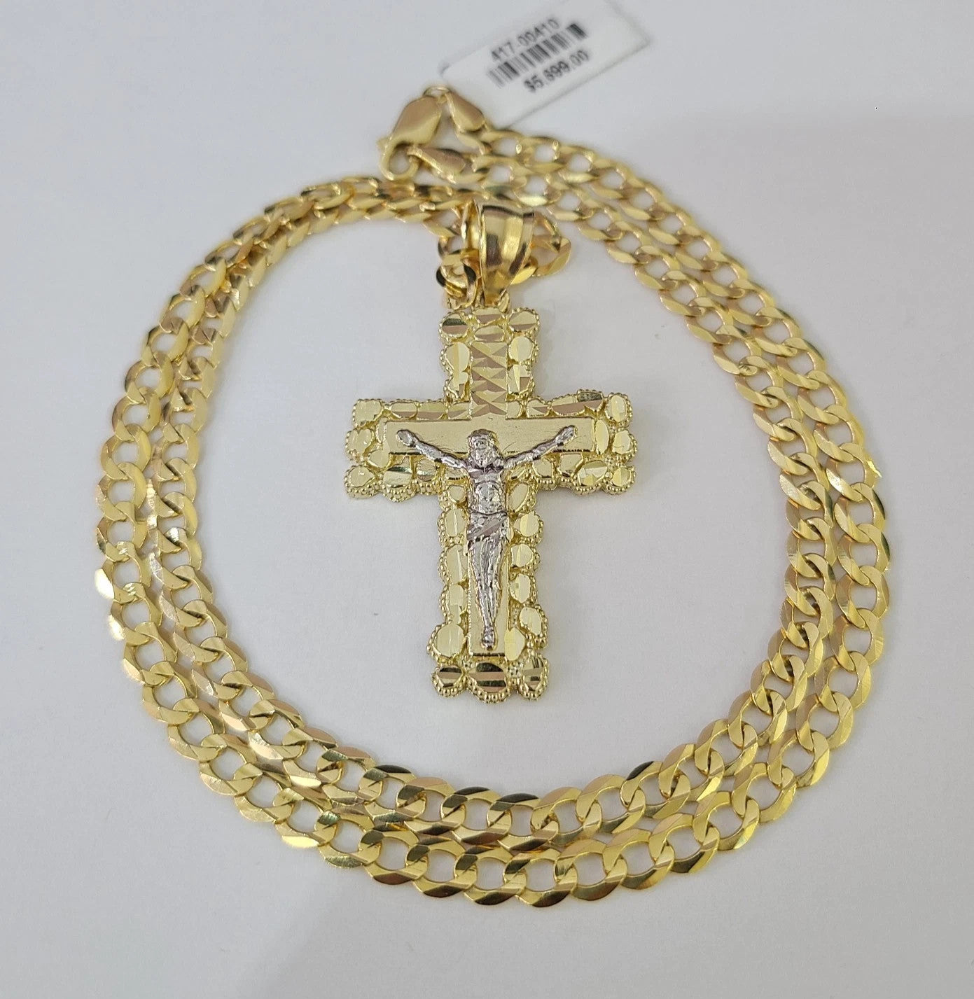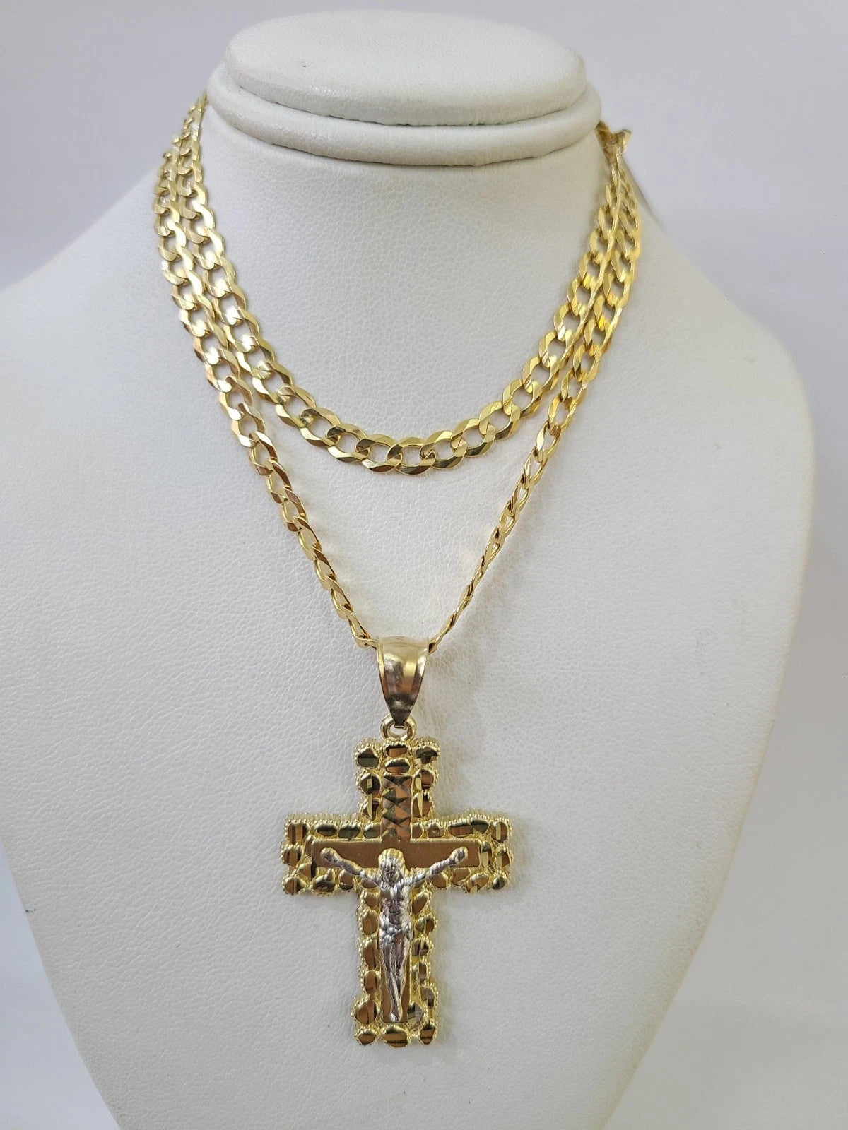 10k Gold Chain Cuban Curb Jesus Cross Charm Pendant Link 5mm 18"-28" Inch SET