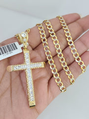10k Gold Chain Jesus Cross Charm Solid Cuban Curb 5mm 18"-28" Inch SET