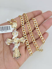 10k Gold Chain Jesus Spiral Cross Charm Solid Cuban Curb 5mm 18"-28" Inch SET
