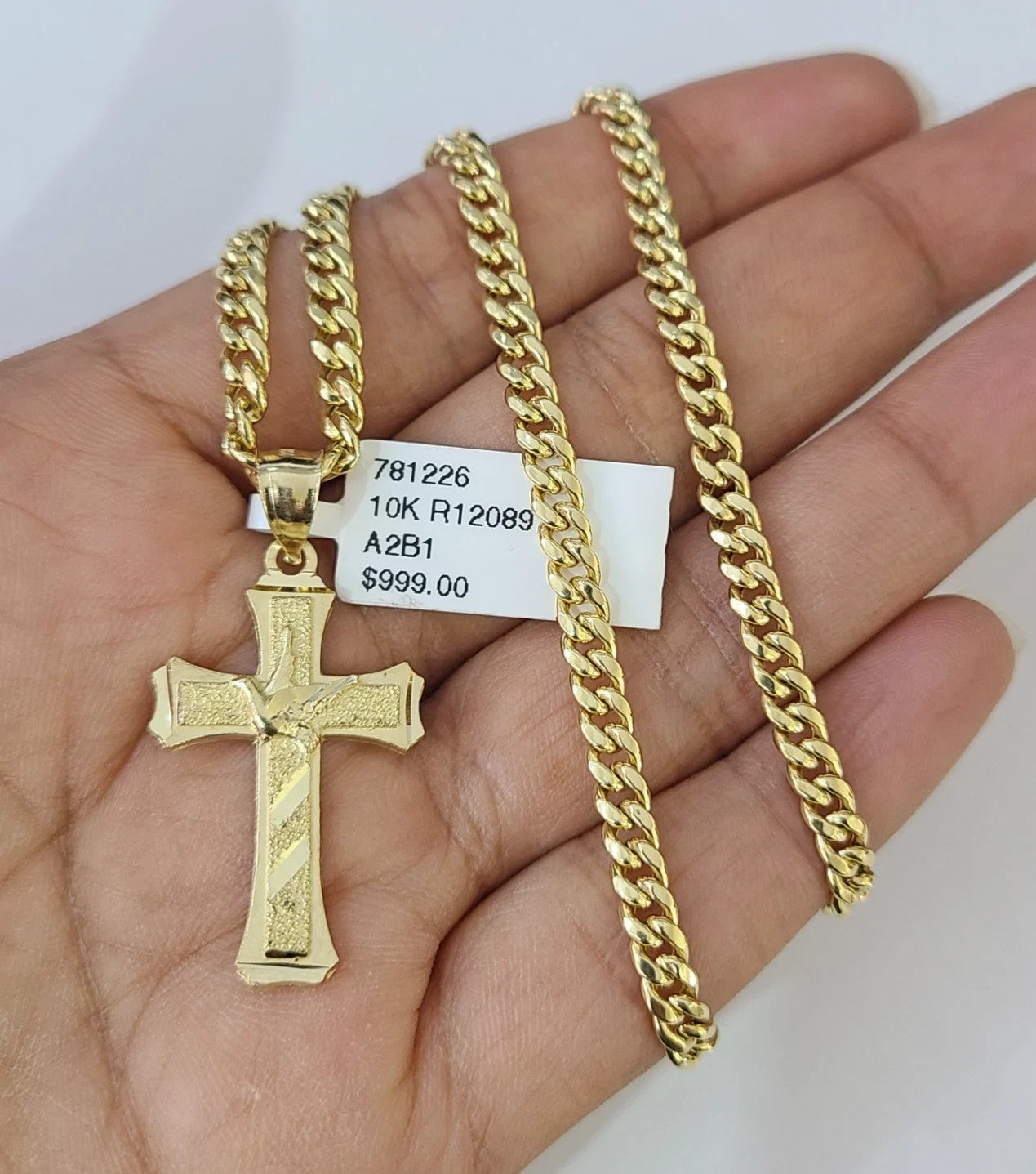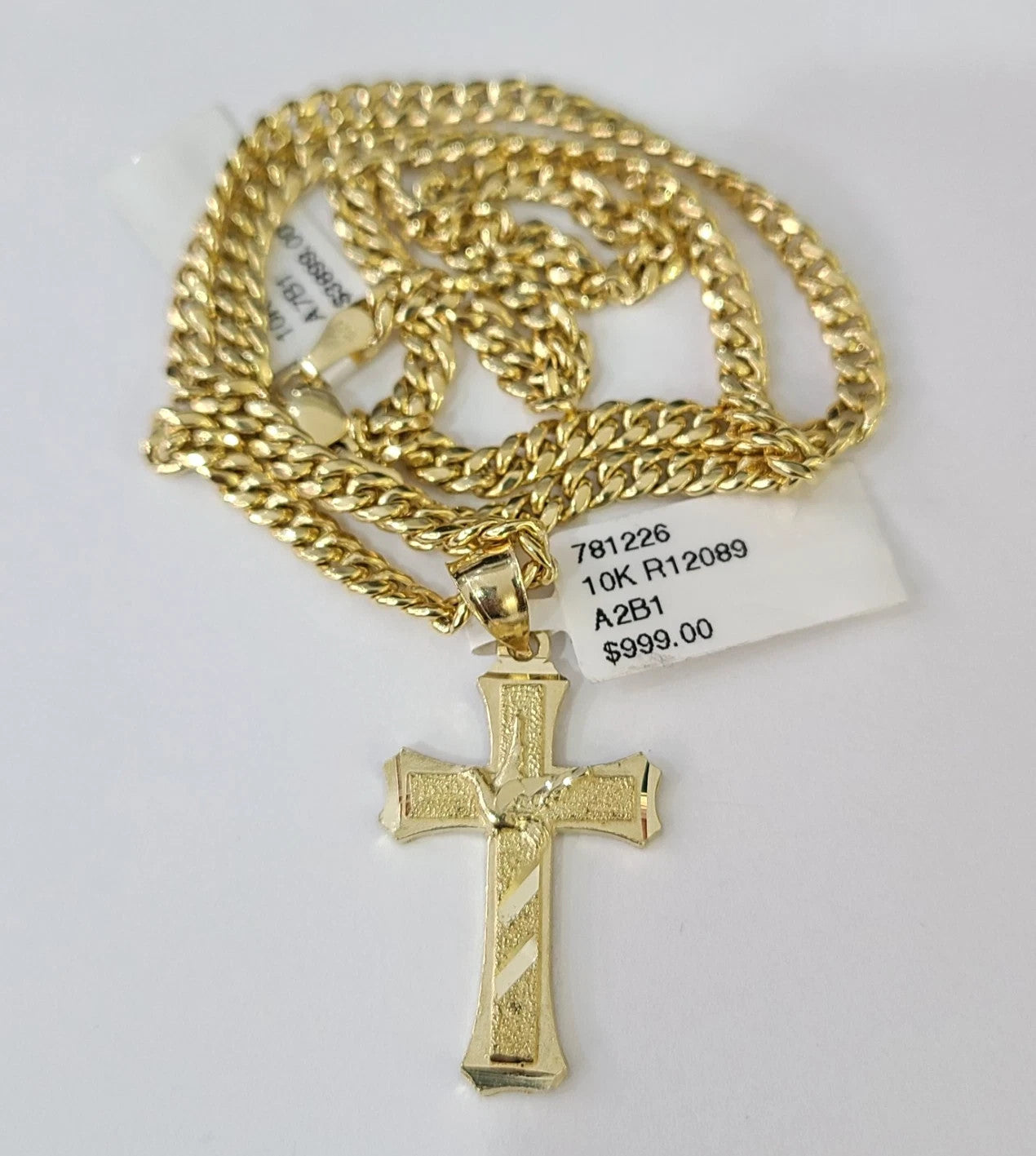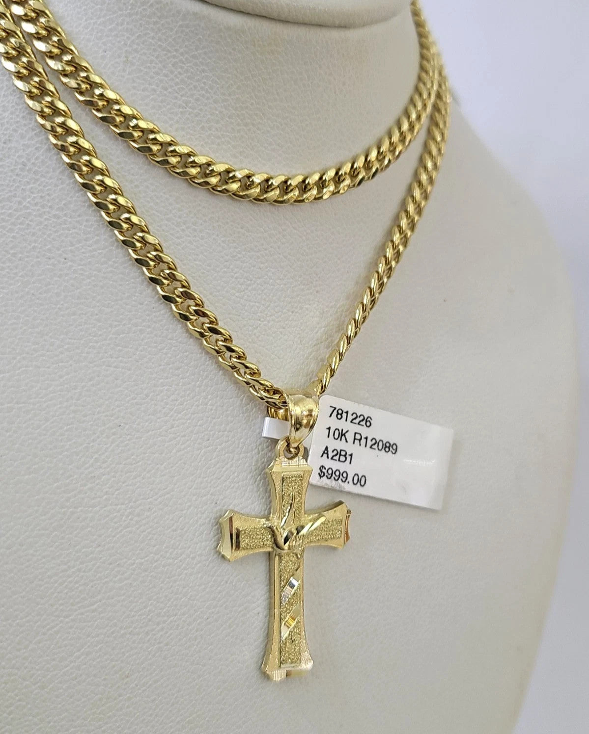 10k Gold Chain Miami Cuban Jesus Cross Charm Pendant Set 4mm 18"-28" Necklace - 20 Inch