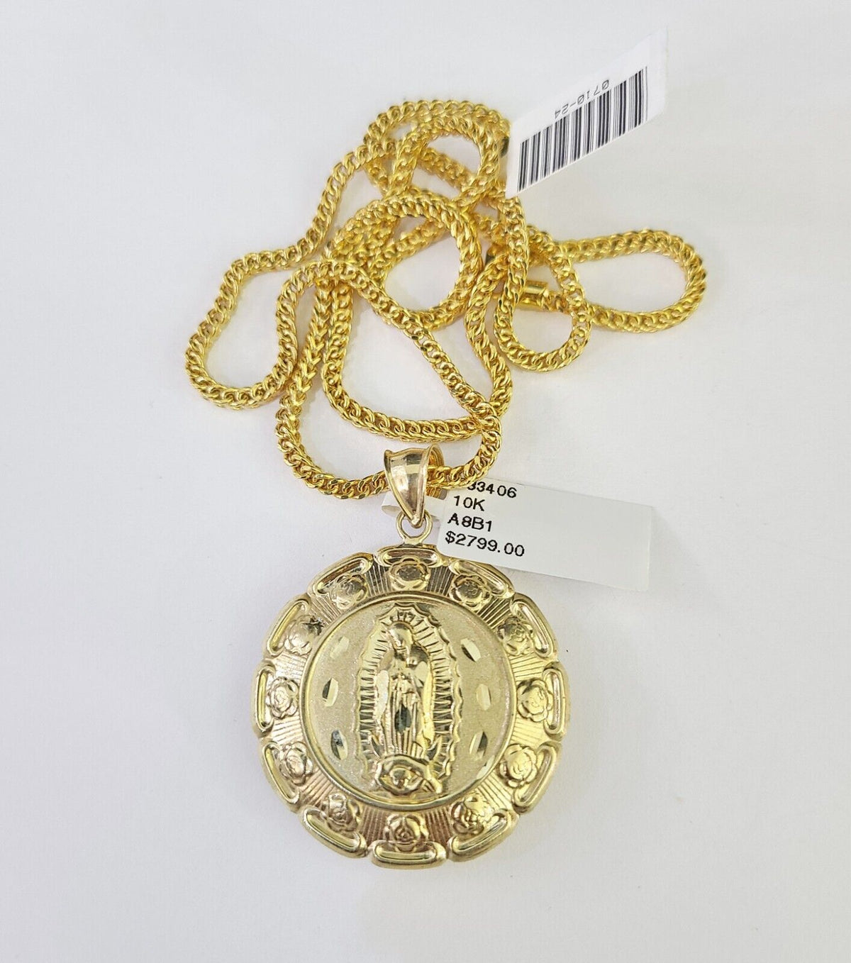 Is Presenting You with This Absolutely Stunning Real 10k Yellow Gold Franco Chain 2.5mm, 20-26 Inches with Jesus Virgin Mary Two Sided Charm, Lobster Lock. The links are 10K GOLD and are very strong. 20"A6B5 A8B1