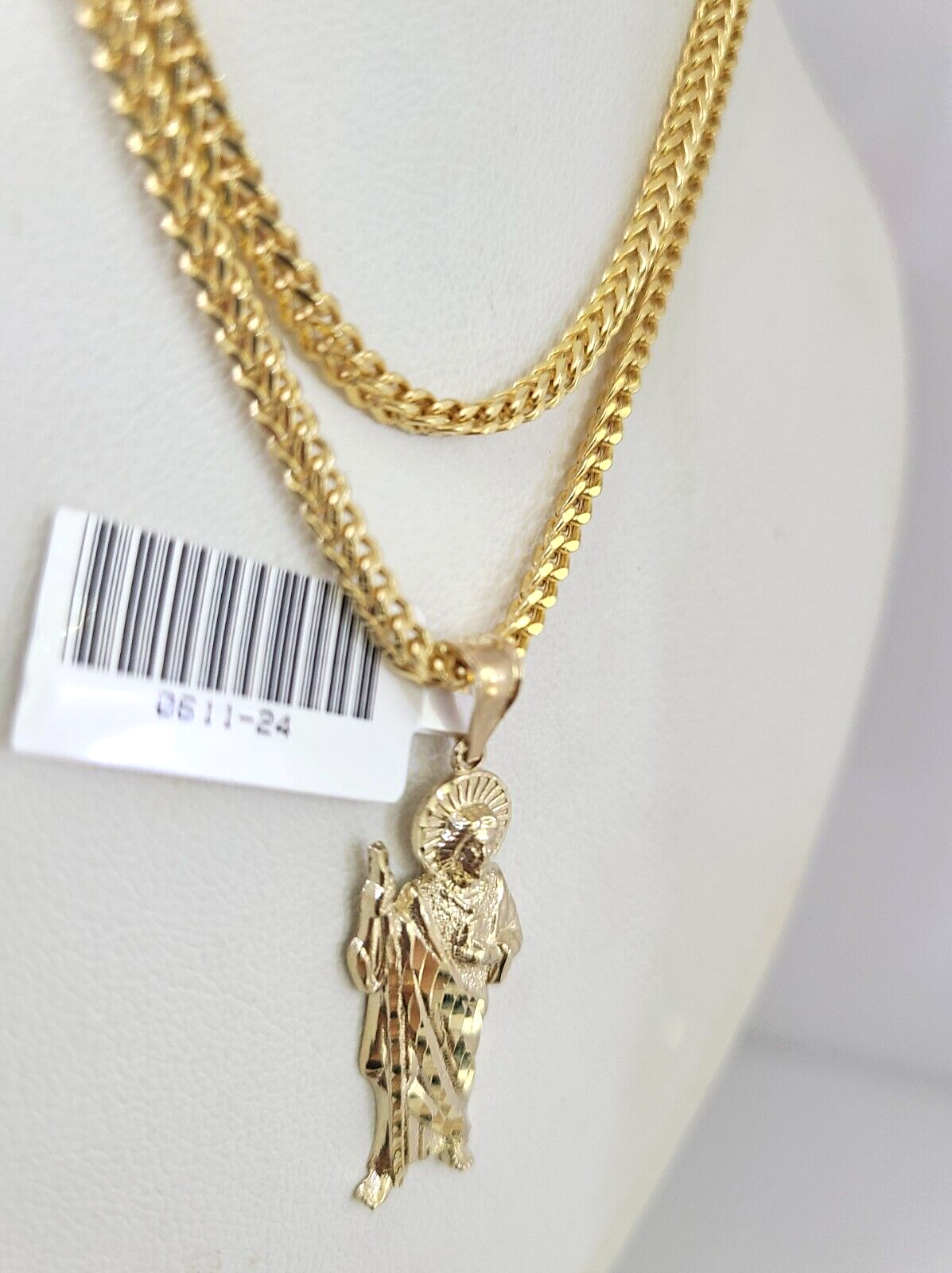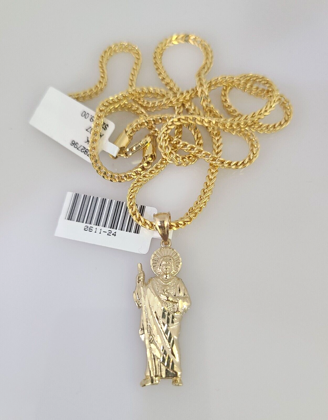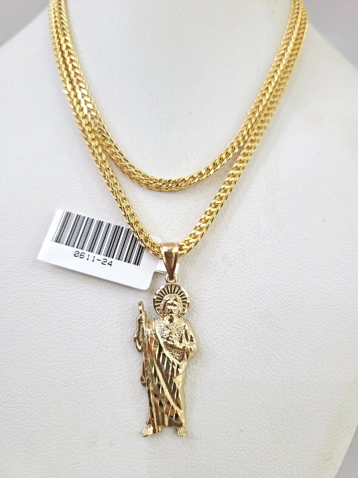 Genuine 10k Yellow Gold Franco Necklace 2.5mm Chain With Saint Jude Charm. The Various length of the Chain are 18"-24" with Saint Jude Charm 1-2 inches (approx.). The pendants are unique in design and considered durable too. If you are not happy with the way it looks or feels, we do offer 30 - Days FREE Return shipping. Contact us for more information.