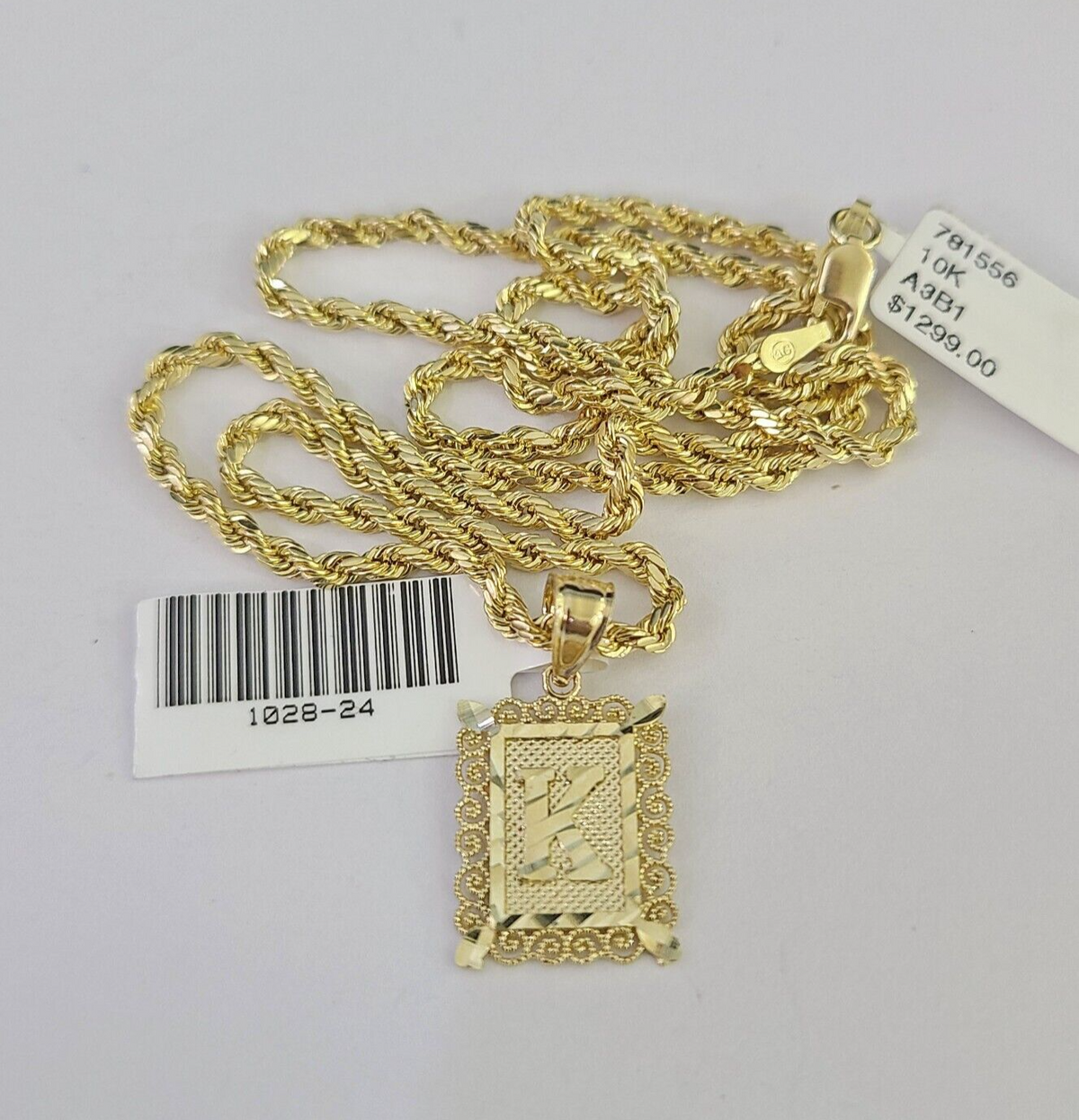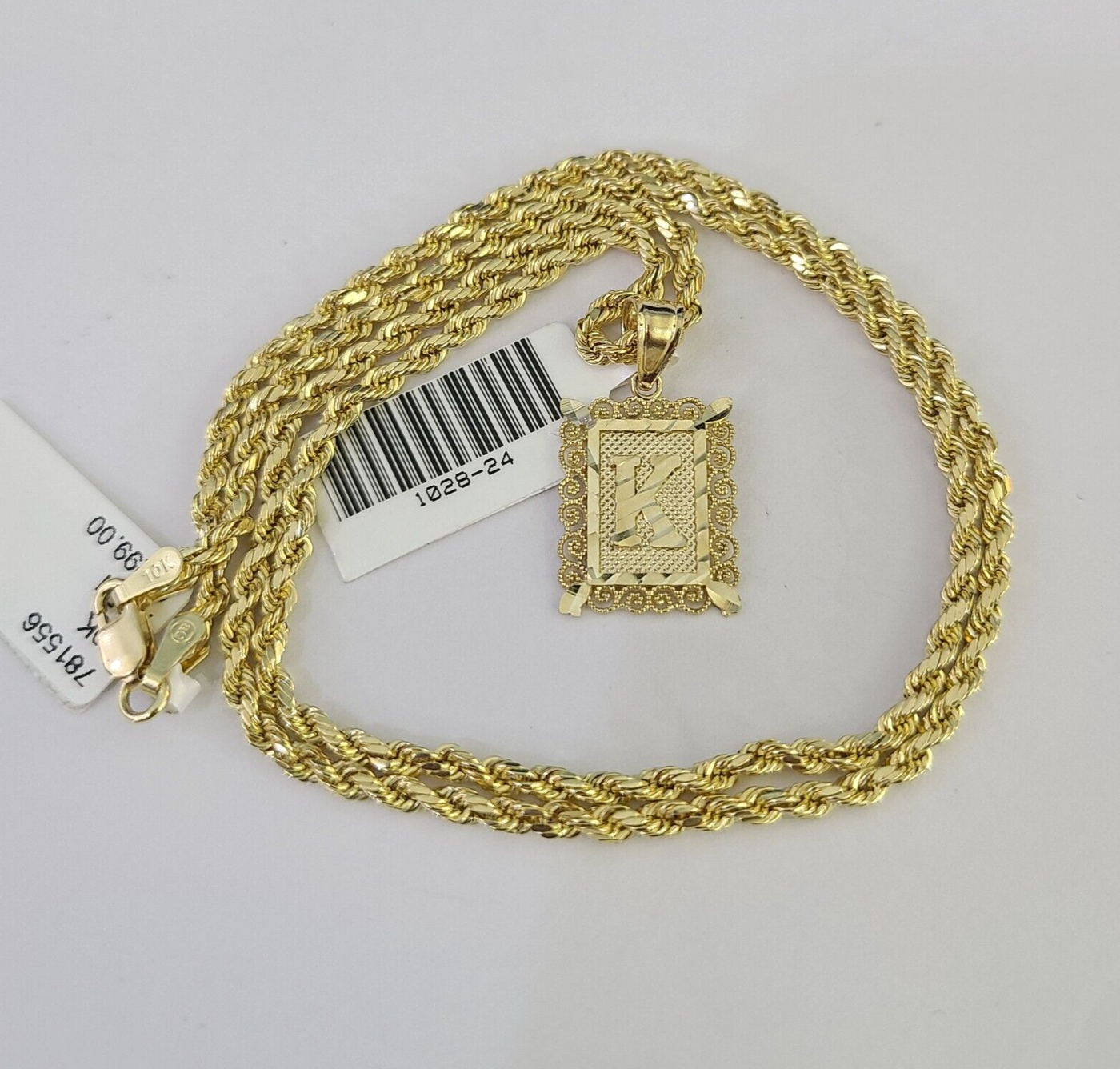 Is Presenting You with This Absolutely Stunning Real 10k Yellow Gold Rope Chain 2.5mm, 16-26 Inches Lobster Lock with K Initial/Letter/Alphabet. The links are 10K GOLD and are very strong. 18"-A3B1 A1B0 P12804