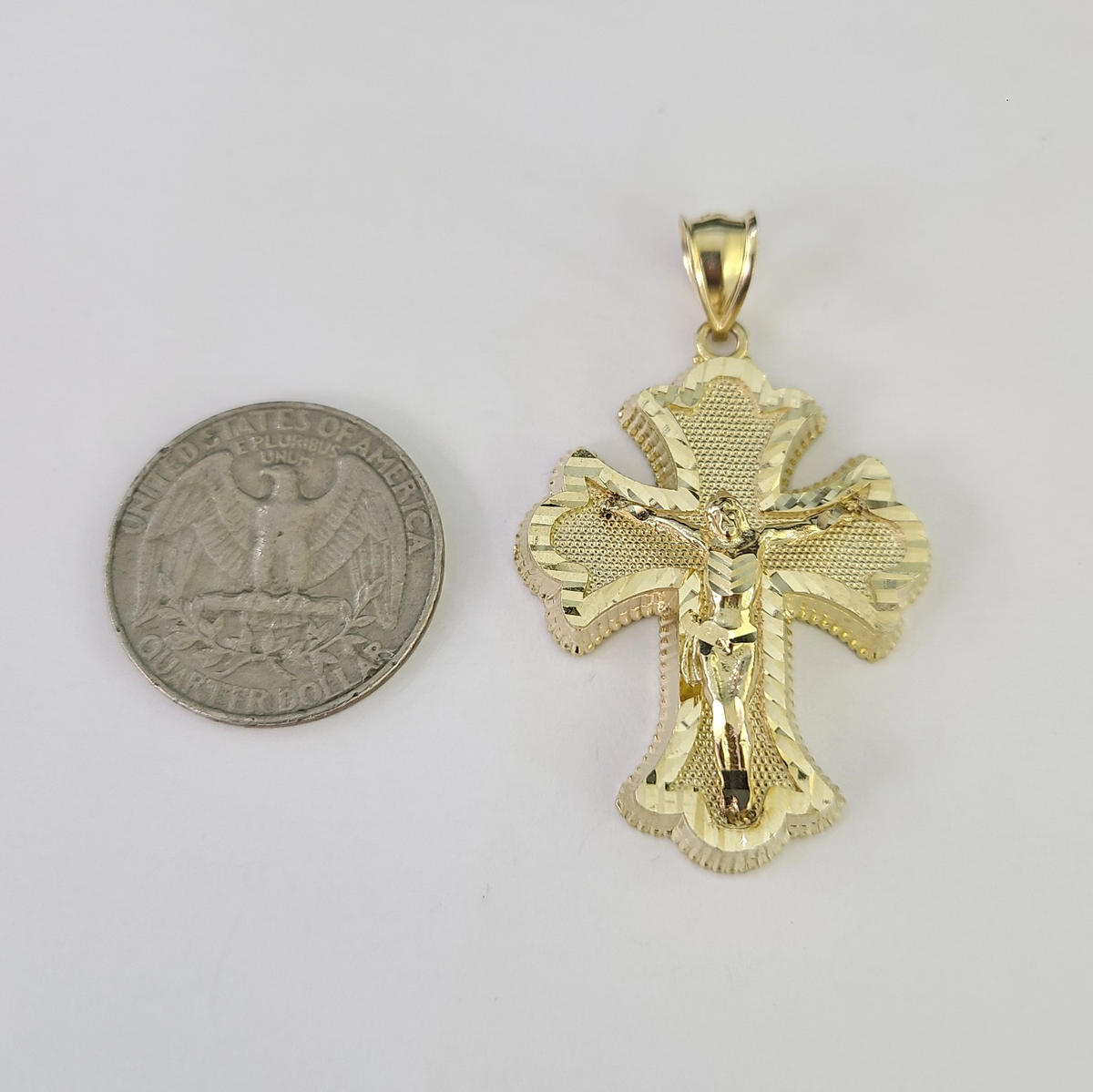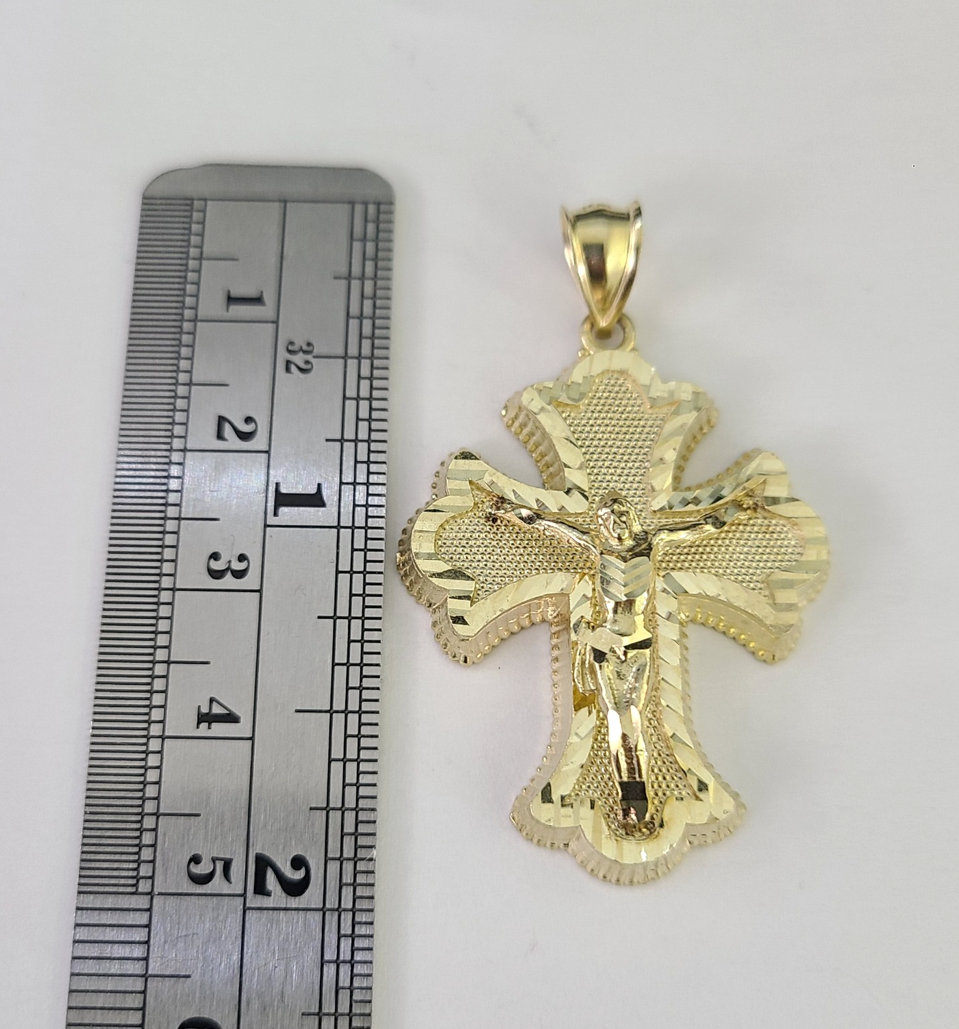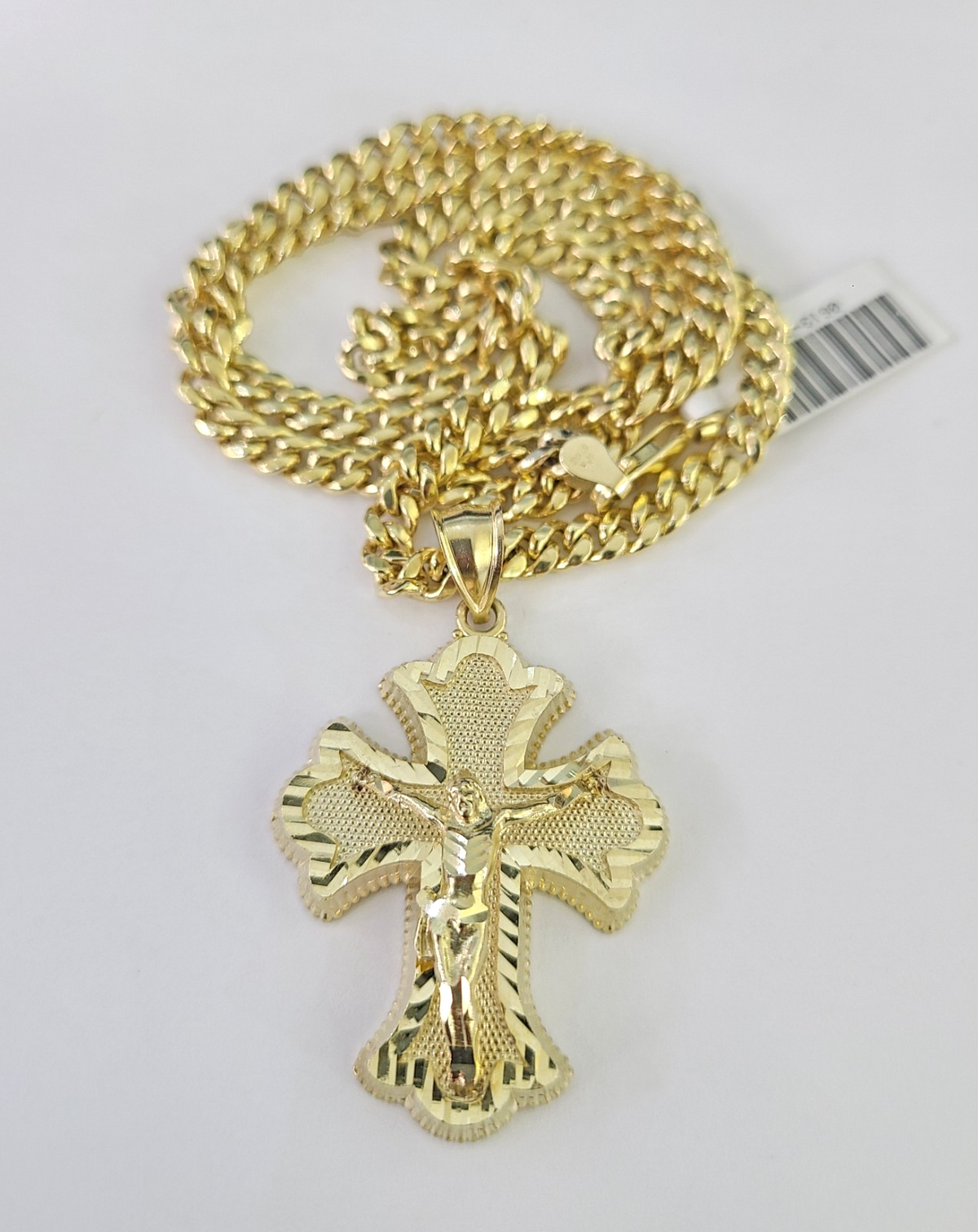 Genuine 10k Yellow Gold Miami Cuban Necklace 5mm Chain with Jesus Crucifix Cross Charm. The Various length of the Chain are 18"-28" with Jesus Crucifix Cross Charm. The pendants are unique in design and considered durable too. If you are not happy with the way it looks or feels, we do offer 30 - Days FREE Return shipping. Contact us for more information.