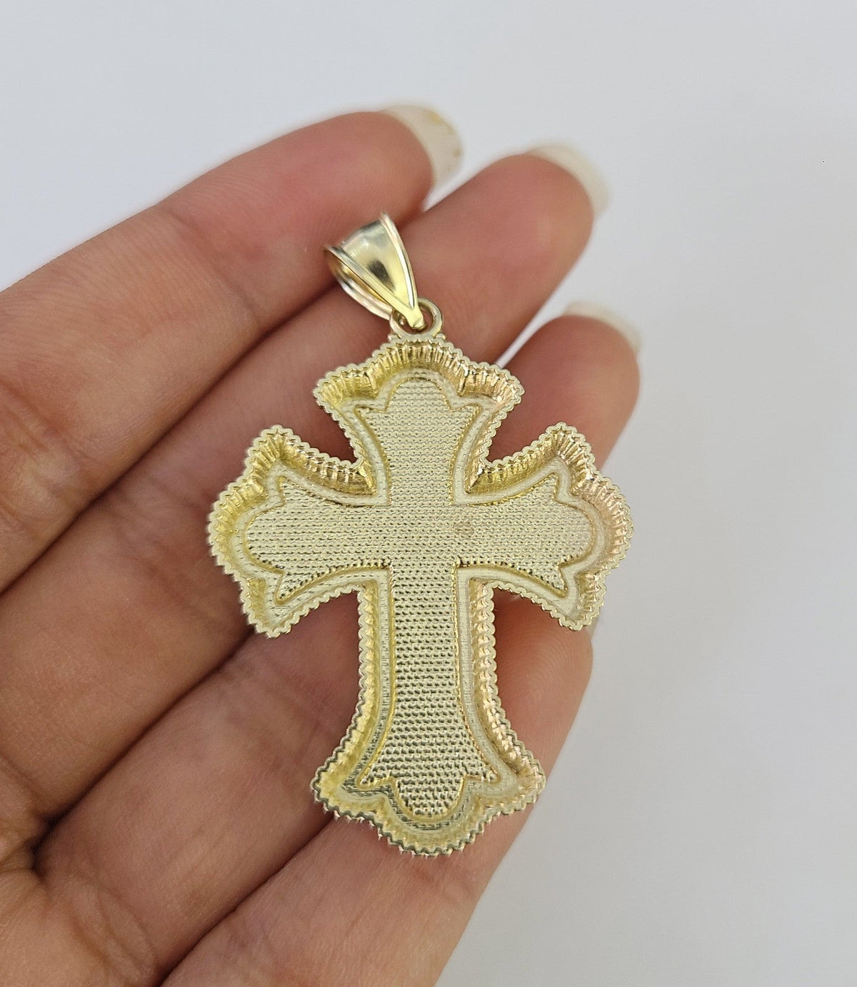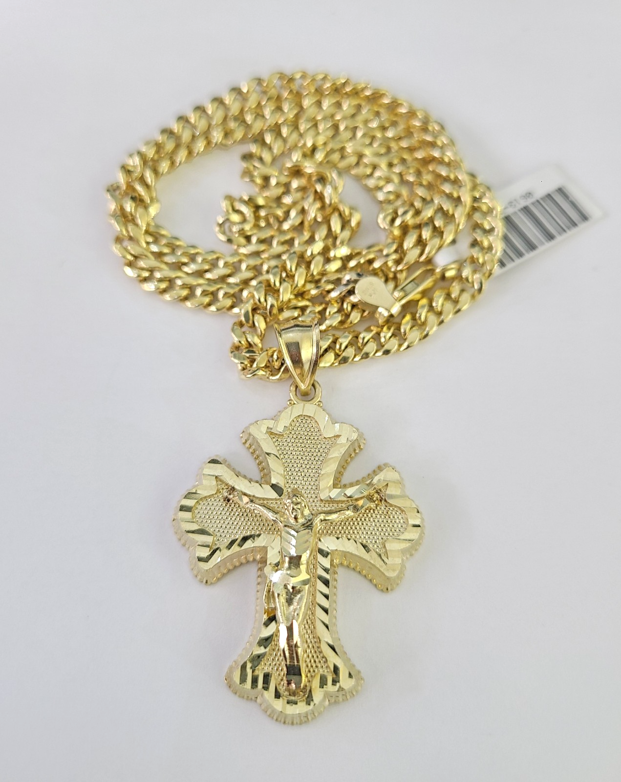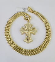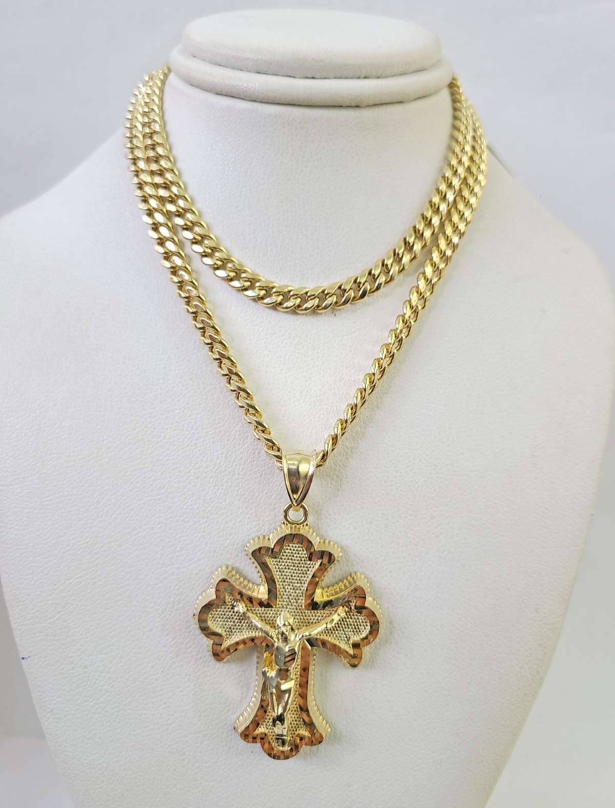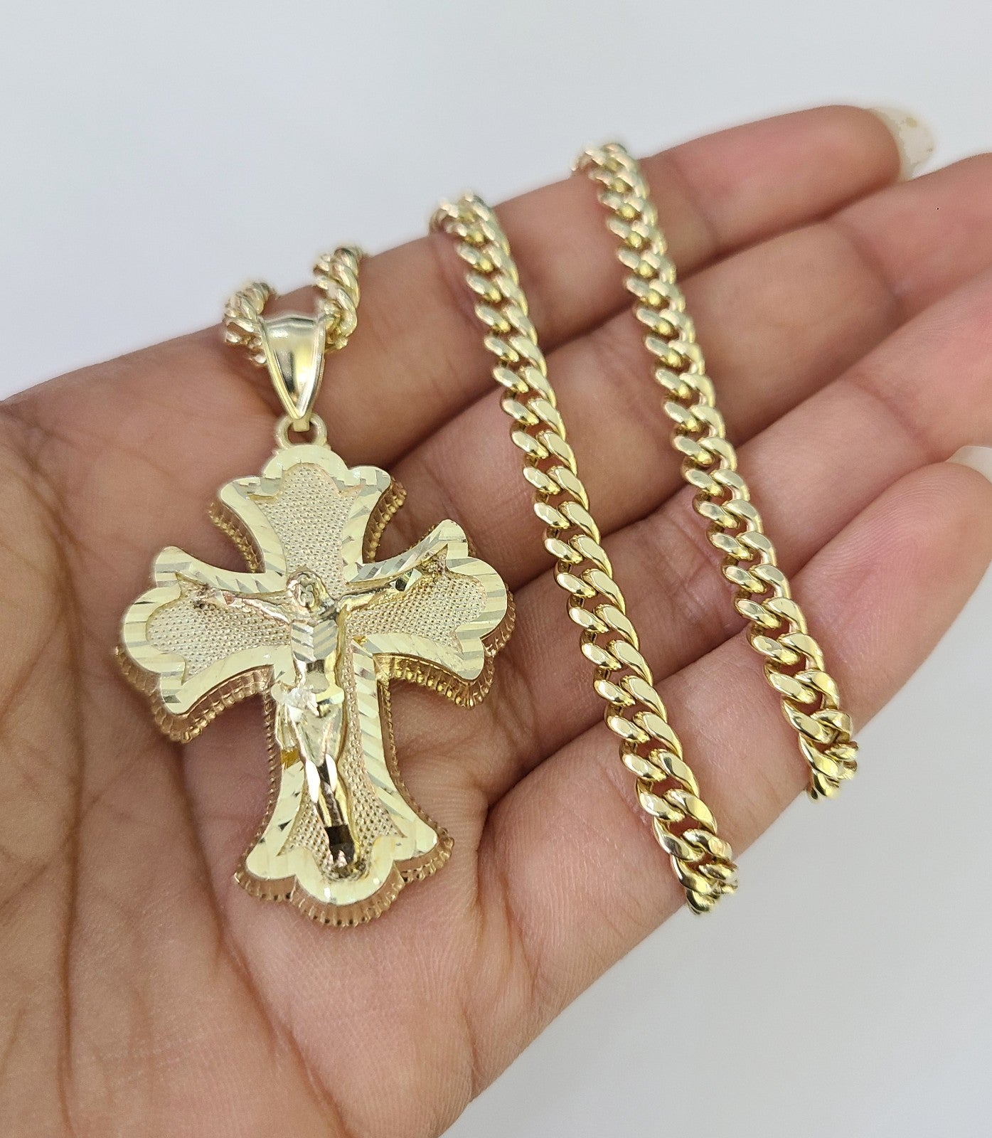 10kt Gold Miami Cuban Chain Jesus Crucifix Cross Charm Pendant 5mm 18-28 Inch Necklace SALE