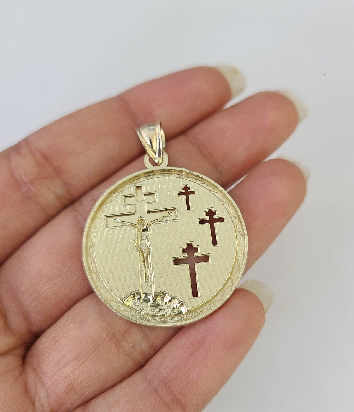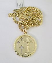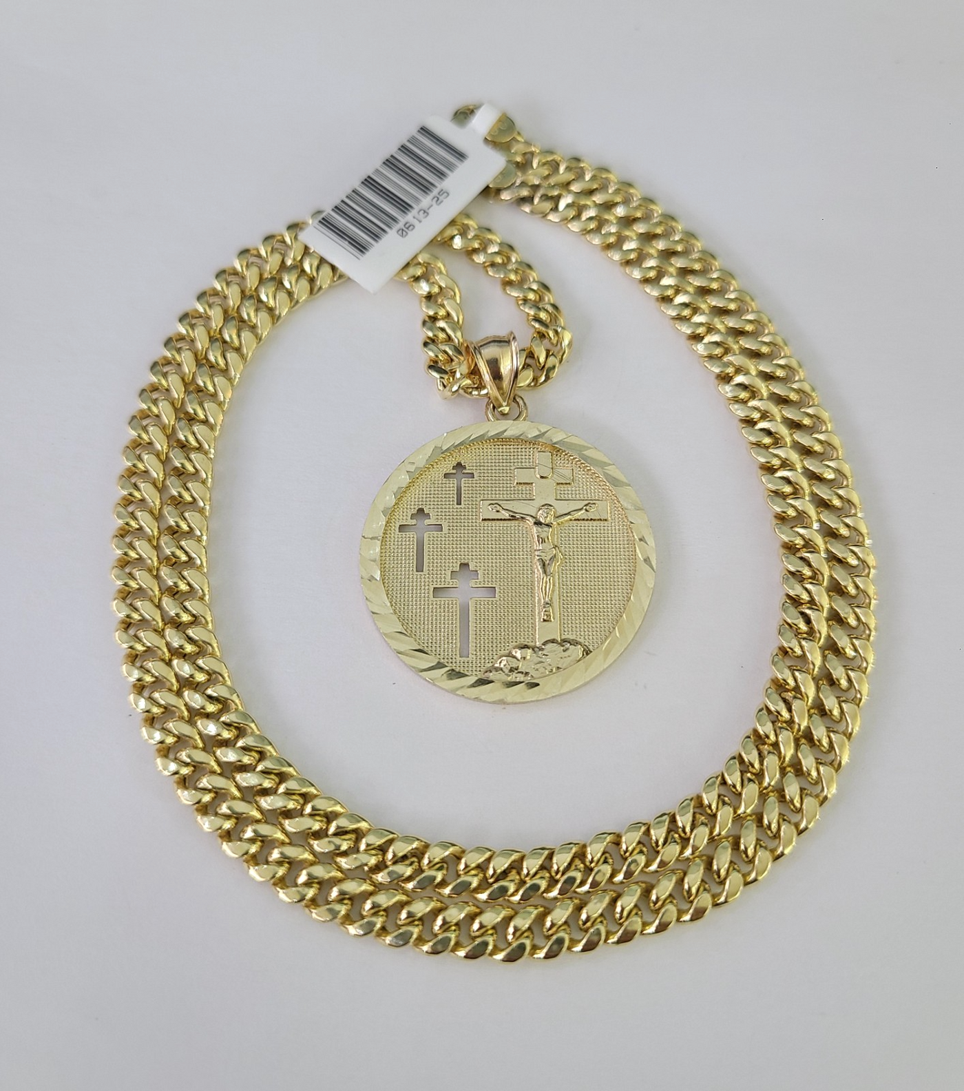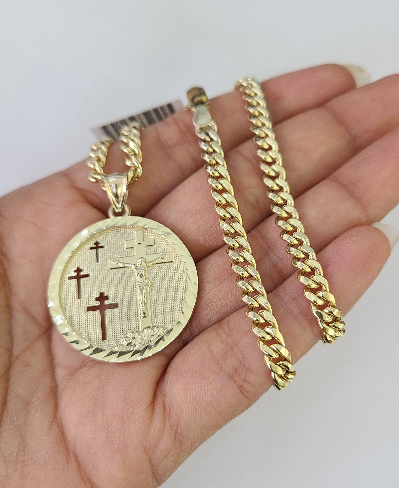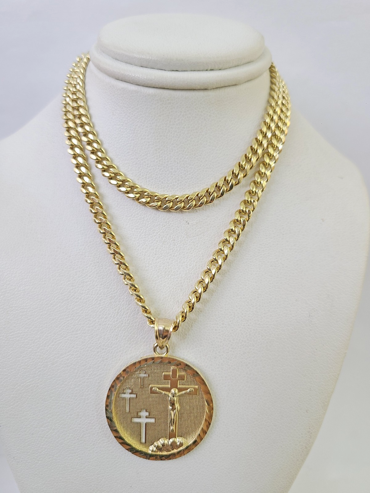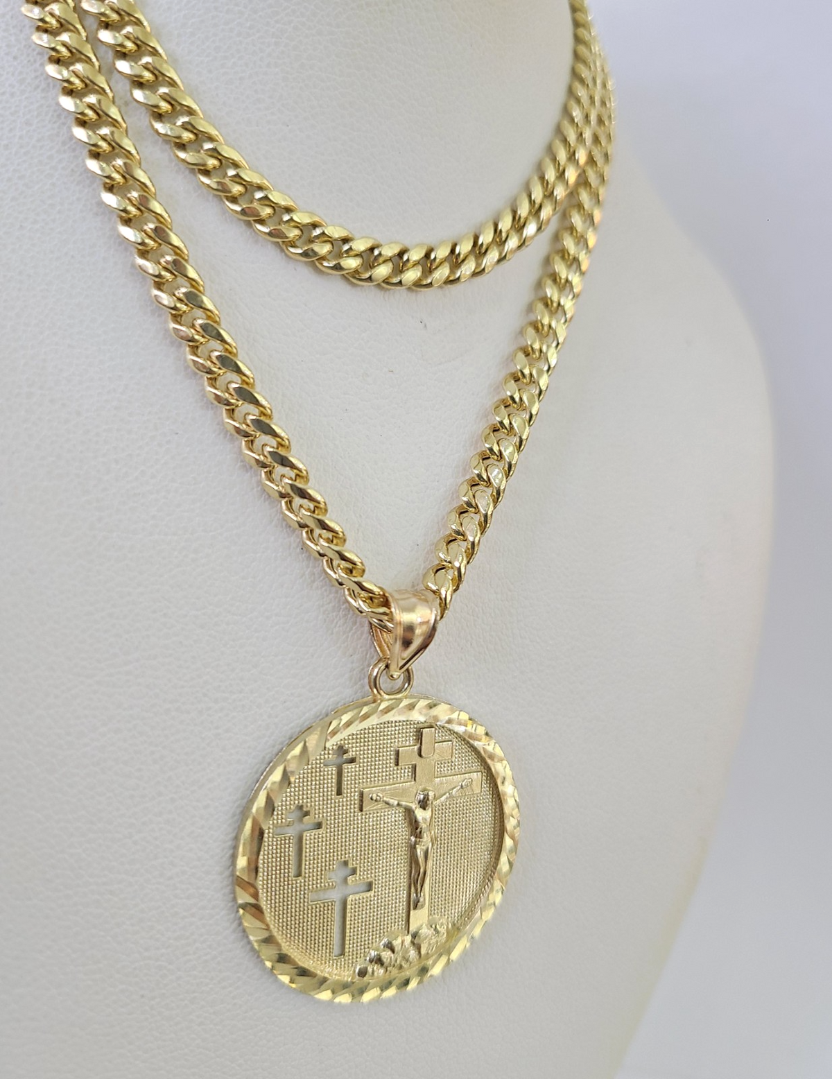 10kt Gold Miami Cuban Chain Jesus Medallion Cross Charm Pendant 5mm 18-28 Inch Necklace SALE