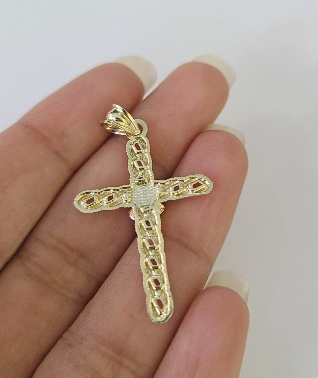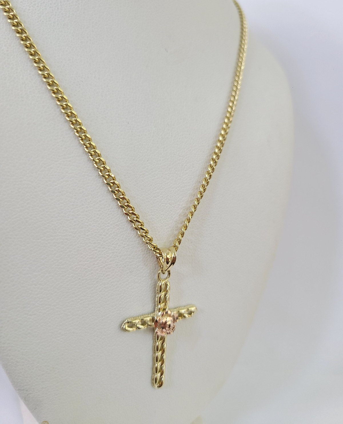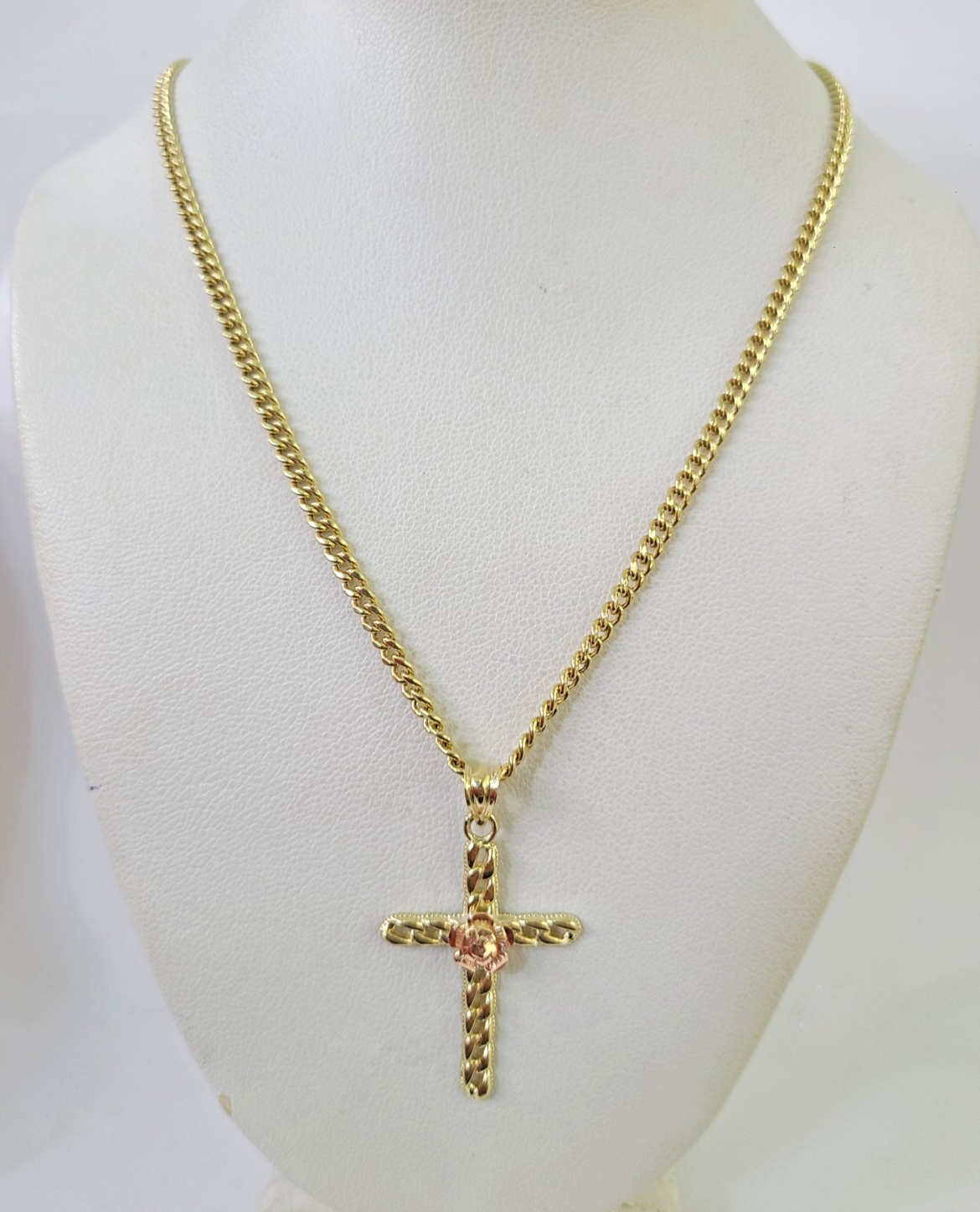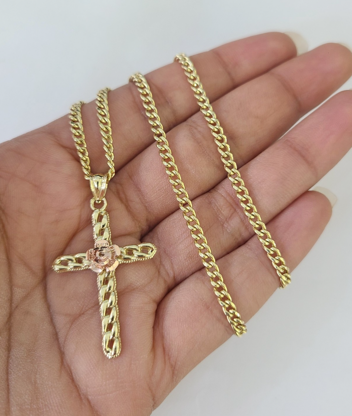 Genuine 10k Yellow Gold Miami Cuban Necklace 3mm Chain with Jesus Rose Cross Charm. The Various length of the Chain are 18"-28" with Jesus Rose Cross Charm. The pendants are unique in design and considered durable too. If you are not happy with the way it looks or feels, we do offer 30 - Days FREE Return shipping. Contact us for more information.