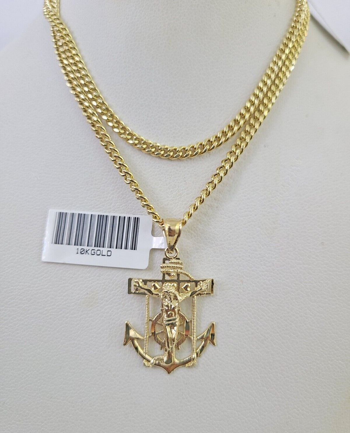 10K Gold Miami Cuban Chain Jesus Anchor Charm 18"-28" 3mm REAL Pendant Necklace