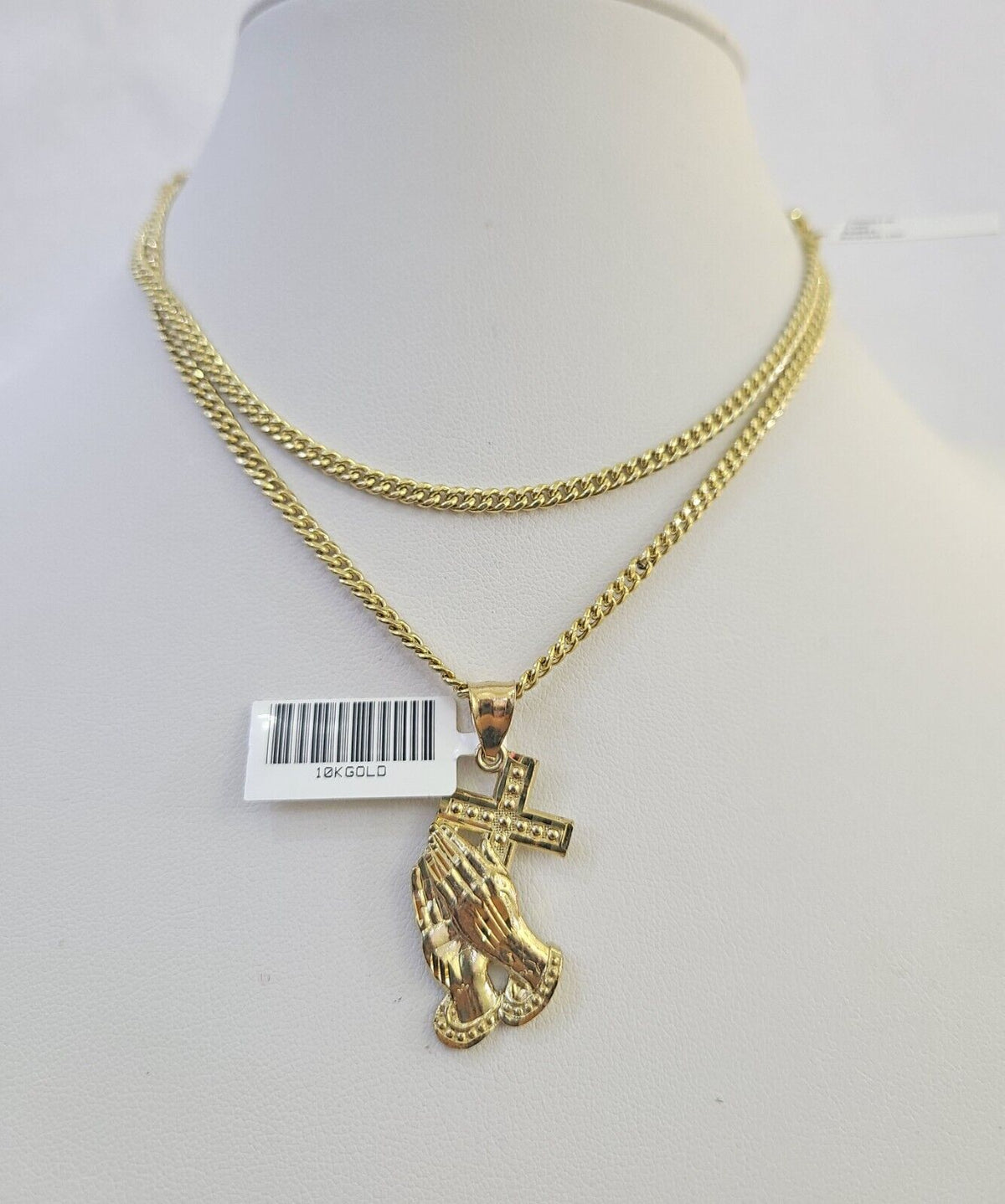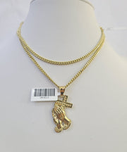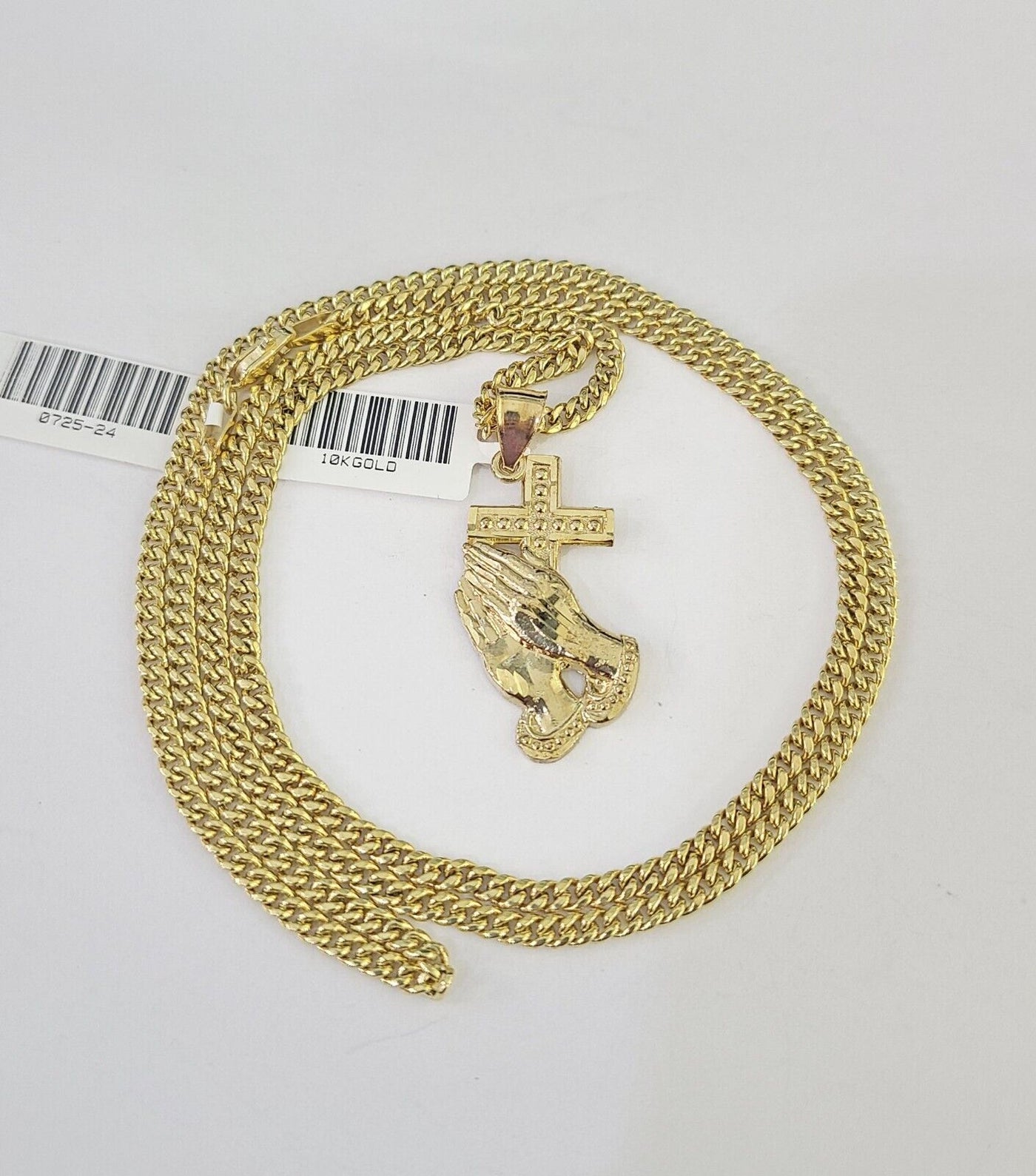 Is Presenting You with This Absolutely Stunning Real 10k Yellow Gold Miami Cuban Chain 3mm, 18"-30" with Praying Hands Charm, Lobster Lock. The links are 10K GOLD and are very strong. These Beautiful Chains will not tarnish, discolor, or fade because they are Pure 10K Gold. We also have them in various another length. Please feel free to contact us if you have any queries regarding the item. 20"-A5B0 A2B5