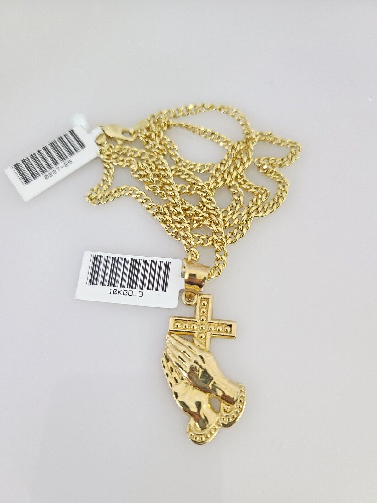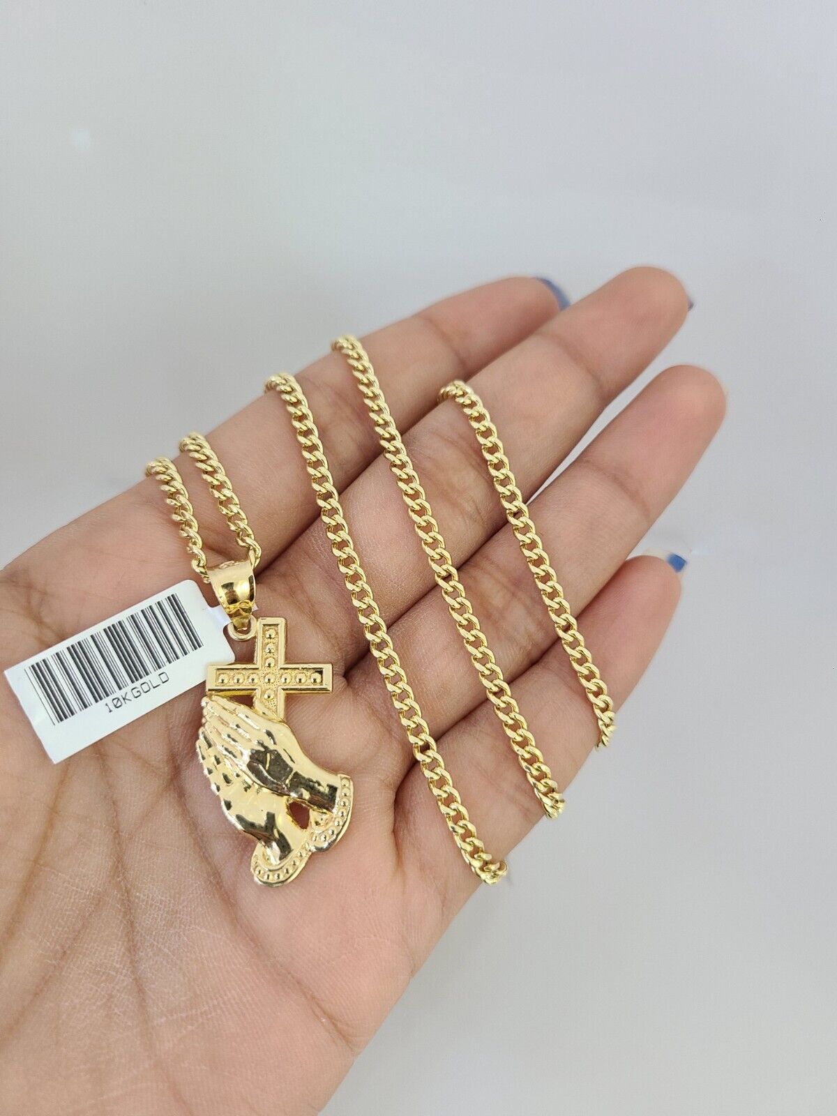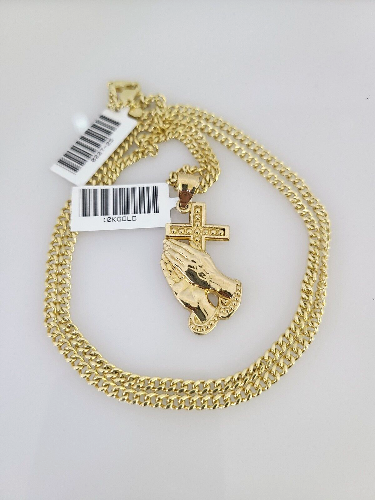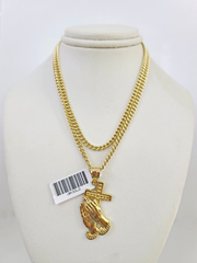 10kt Gold Miami Cuban Chain Praying Hands Charm Pendant 3mm 18-28 Inch Necklace SALE