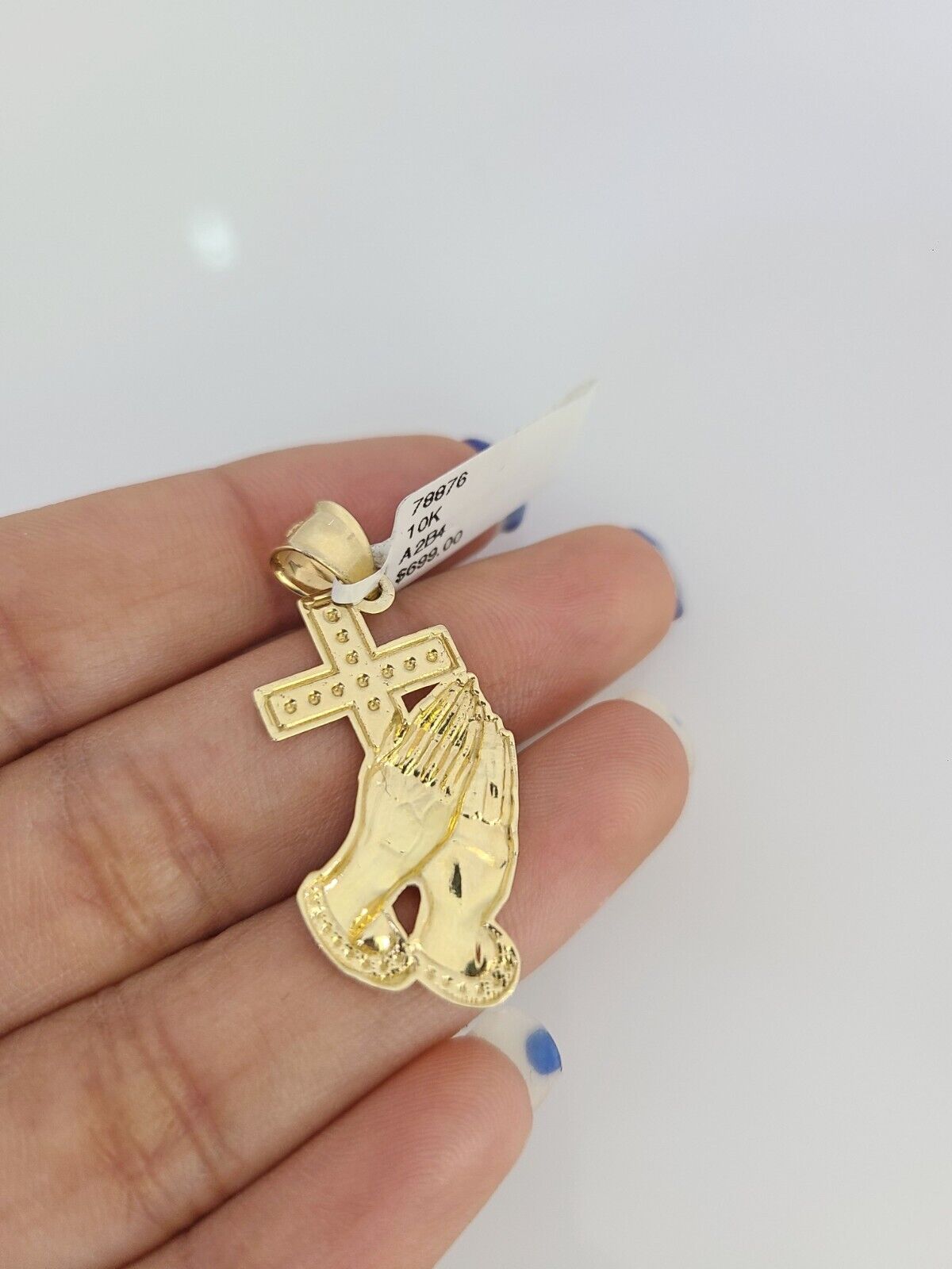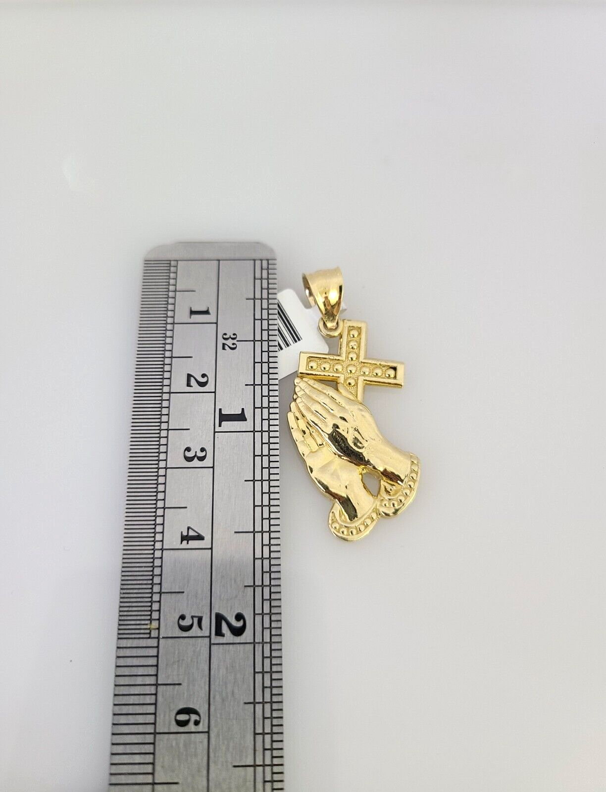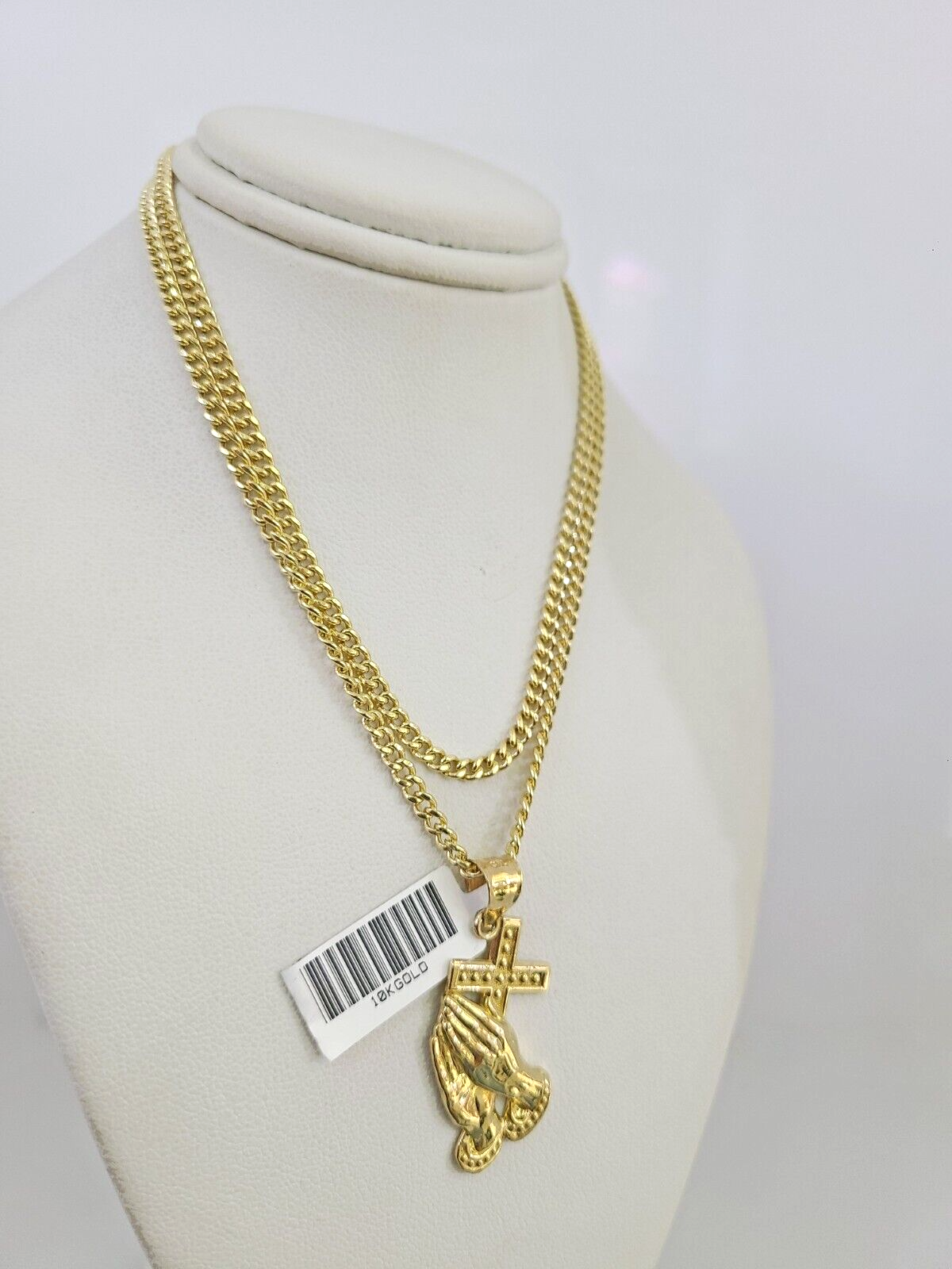 10kt Gold Miami Cuban Chain Praying Hands Charm Pendant 3mm 18-28 Inch Necklace SALE