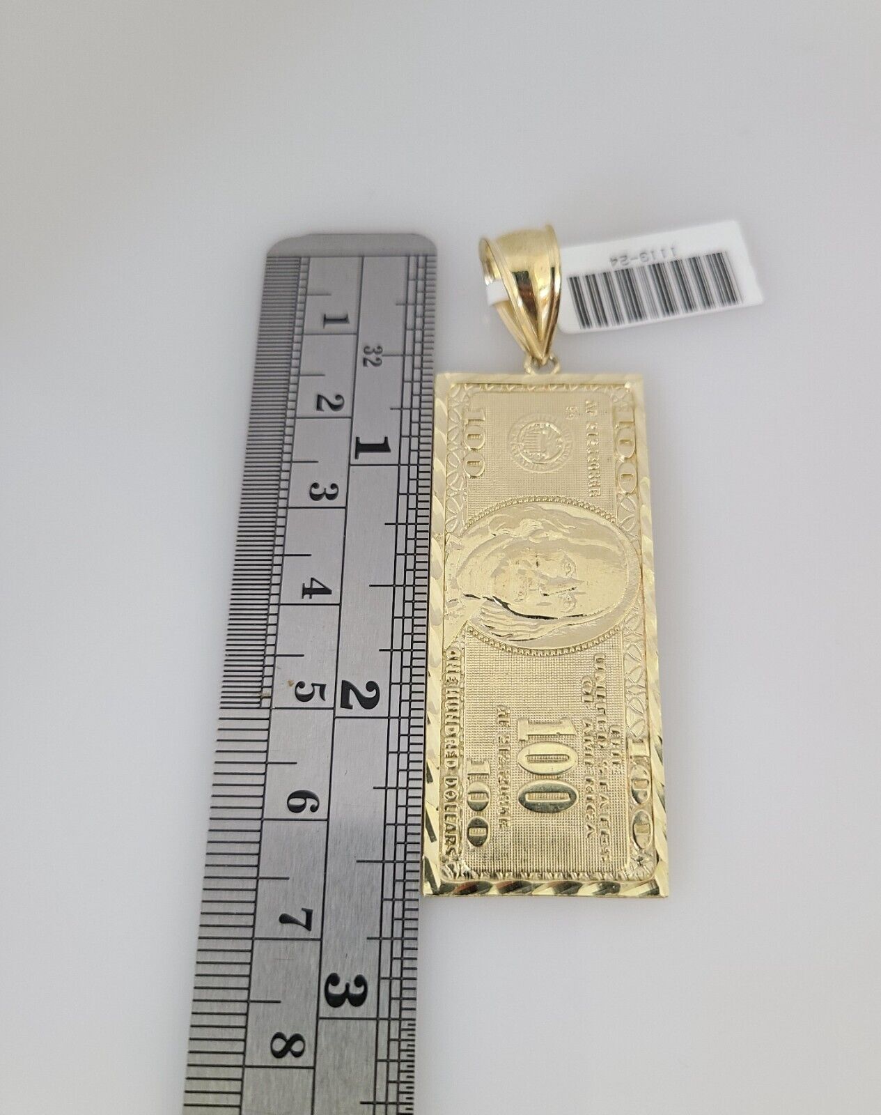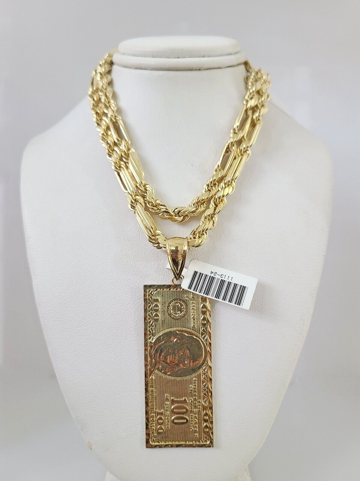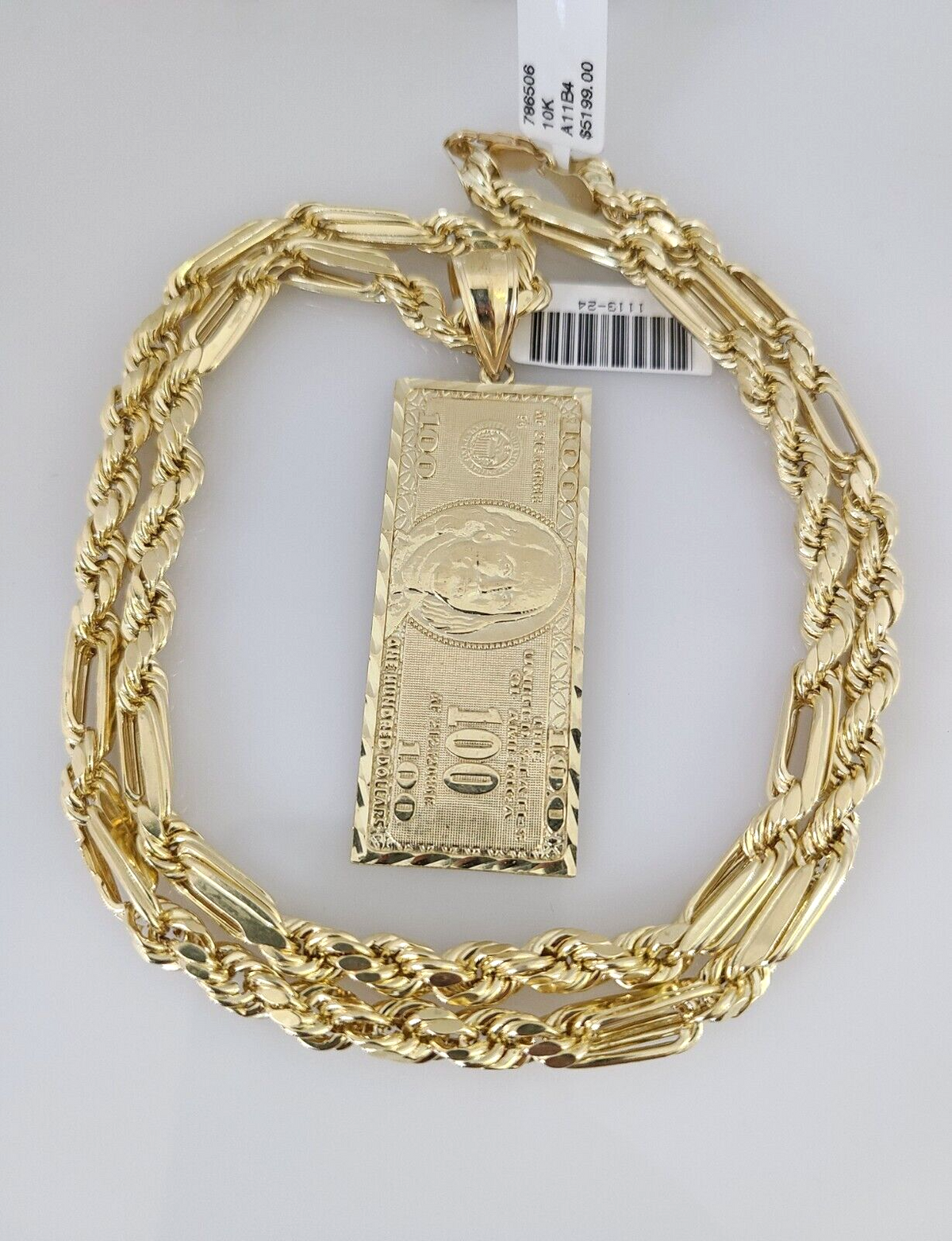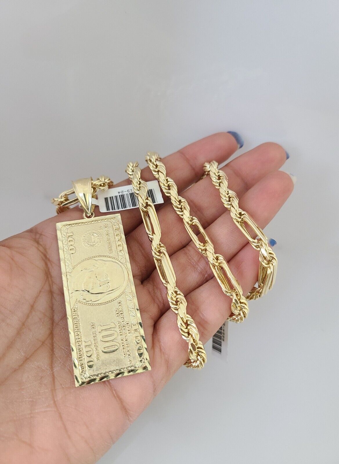 Genuine 10k Yellow Gold Milano Rope Chain 20-26 Inch 6mm Necklace with 100 Dollar Bill Charm design as a SET. The Various length of the Chain are 20-26 Inches. If you are not happy with the way it looks or feels, we do offer 30 - Days FREE Return shipping. Contact us for more information.