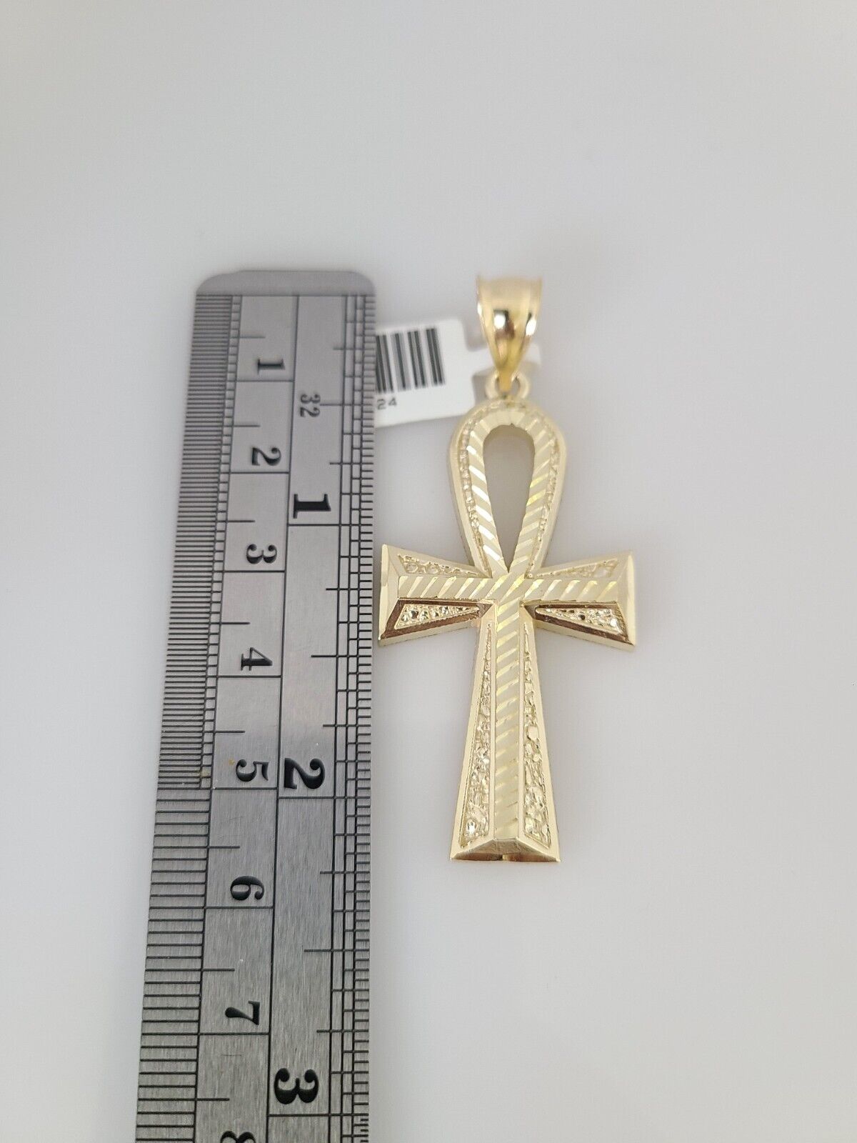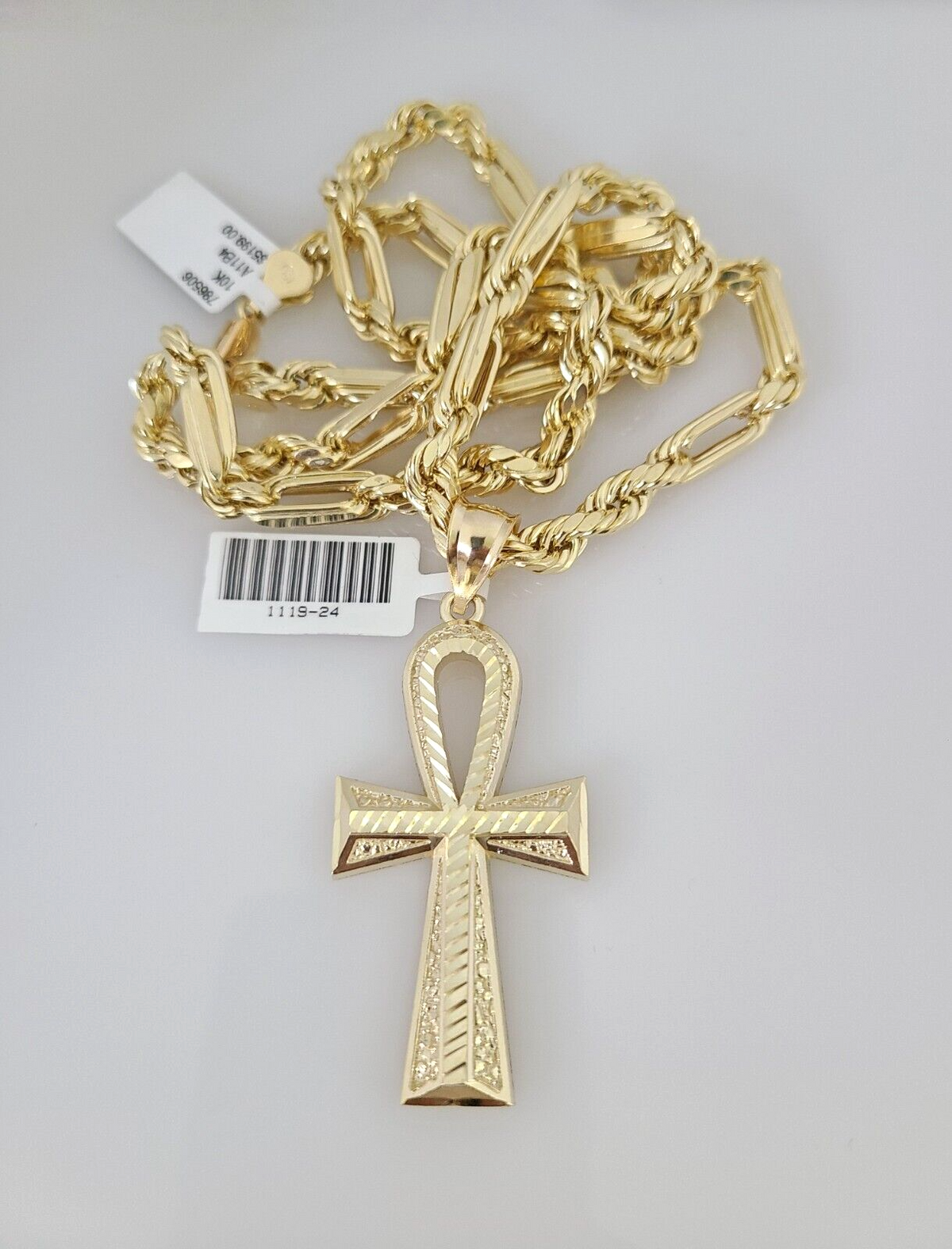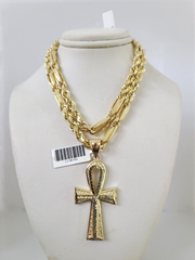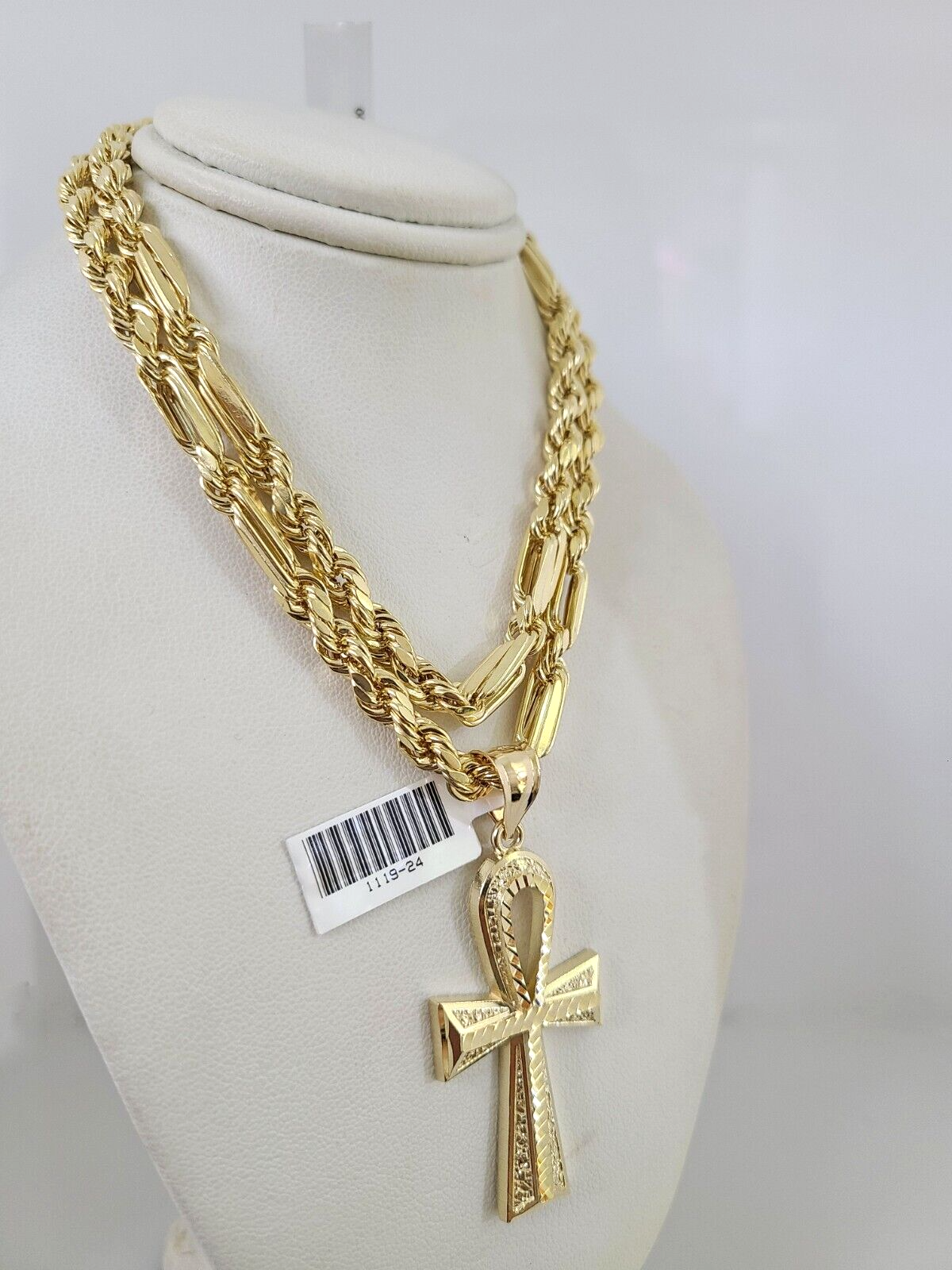 10k Gold Milano Rope Chain Ankh Cross Charm Pendant Set 20"-26'' Inches Necklace