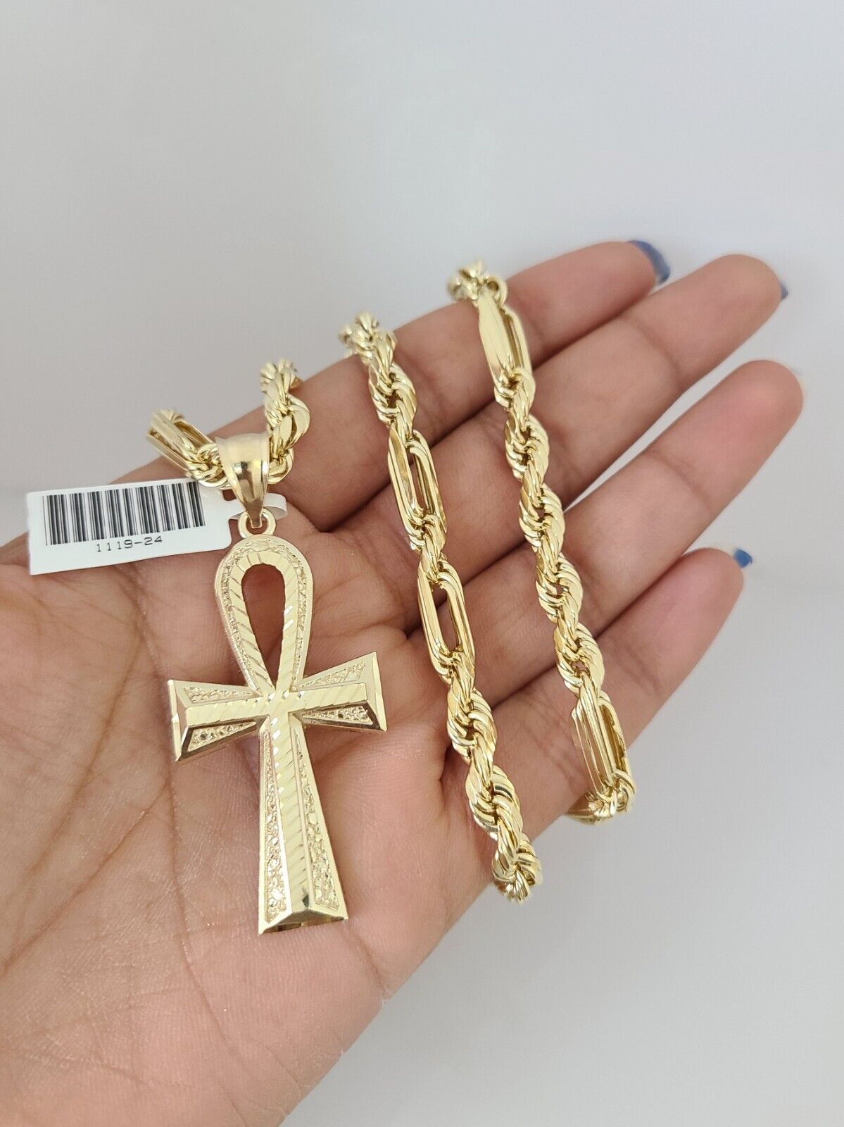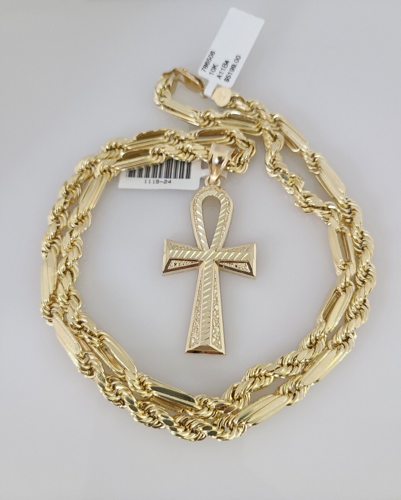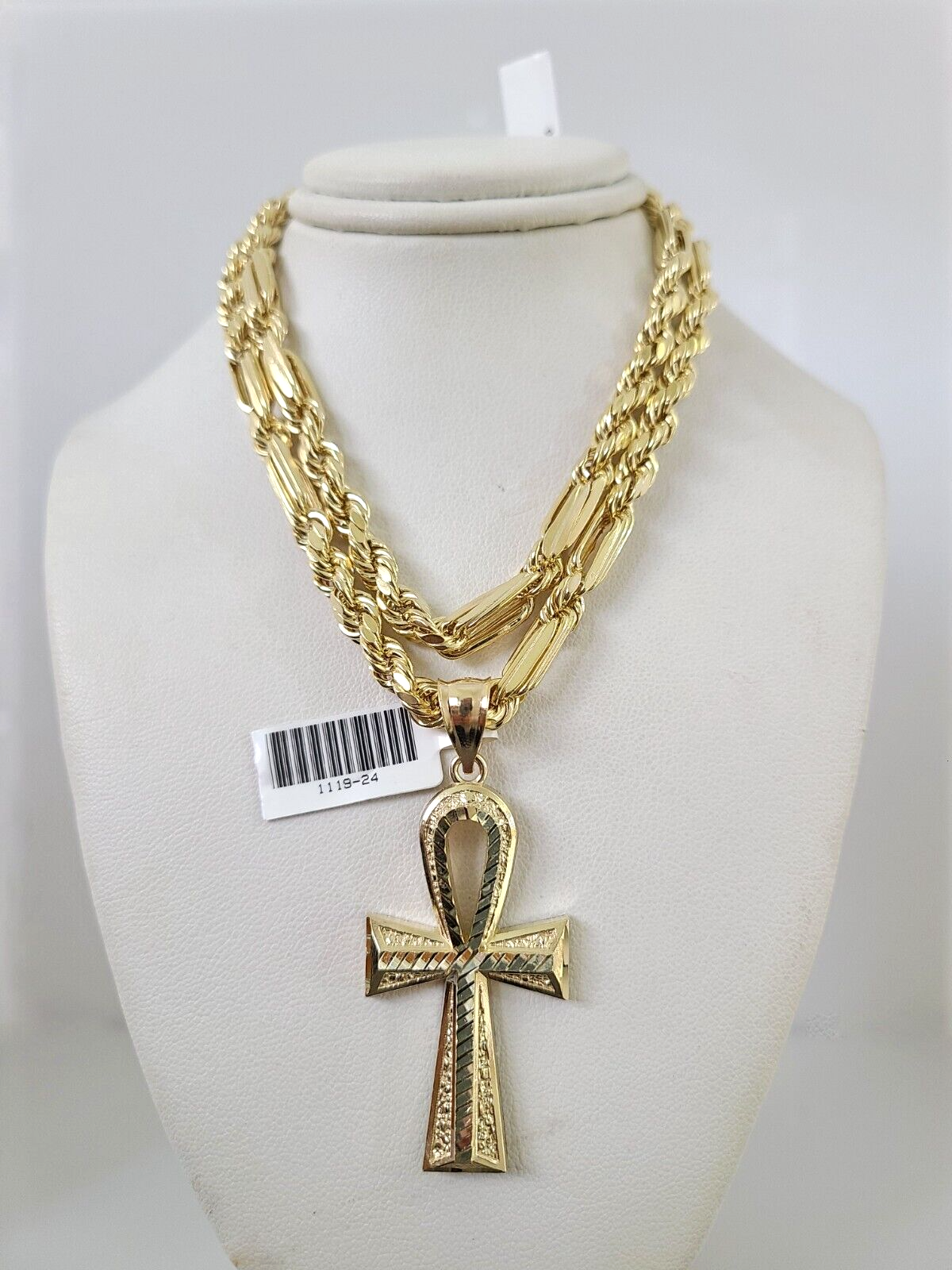 Genuine 10k Yellow Gold Milano Rope Chain 20-26 Inch 6mm Necklace with Ankh Cross Charm design as a SET. The Various length of the Chain are 20-26 Inches. If you are not happy with the way it looks or feels, we do offer 30 - Days FREE Return shipping. Contact us for more information.