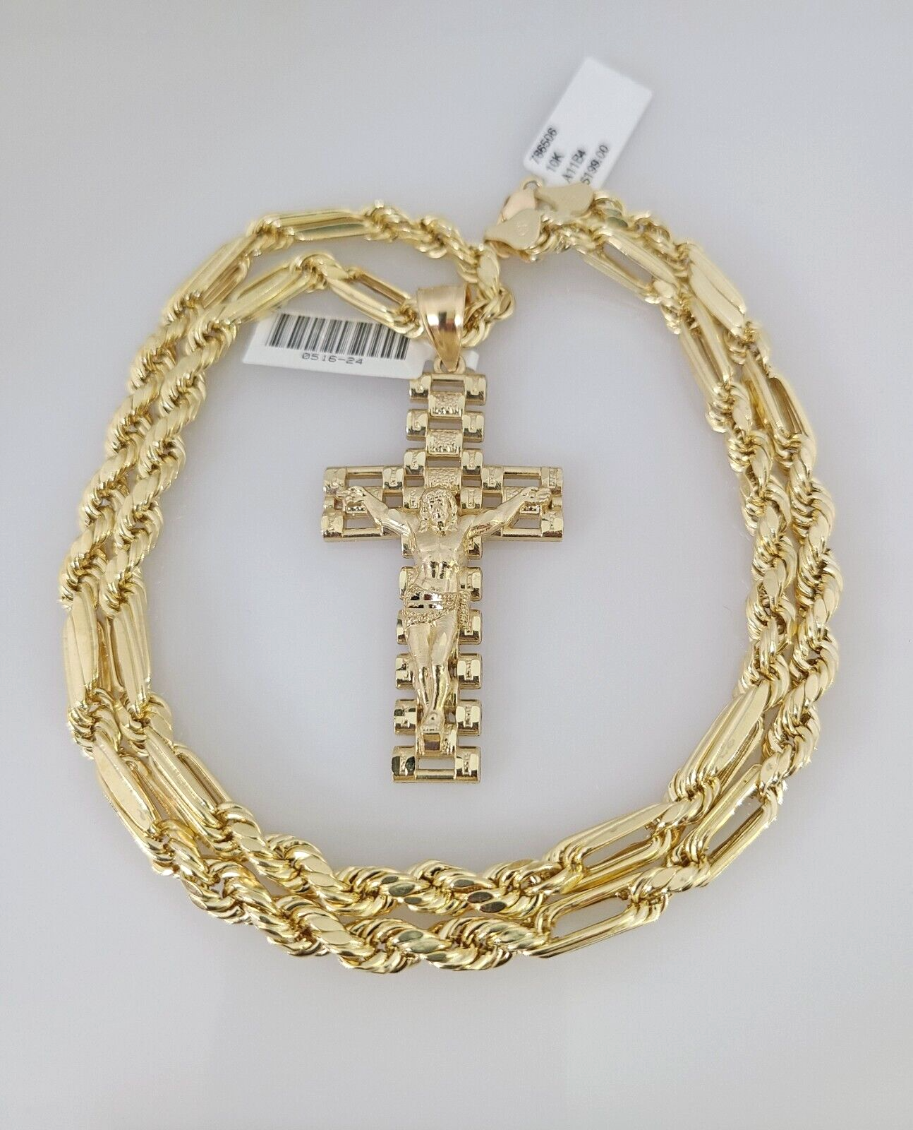 Genuine 10k Yellow Gold Milano Rope Chain 20-26 Inch 6mm Necklace with Jesus Cross Charm design as a SET. The Various length of the Chain are 20-26 Inches. If you are not happy with the way it looks or feels, we do offer 30 - Days FREE Return shipping. Contact us for more information.