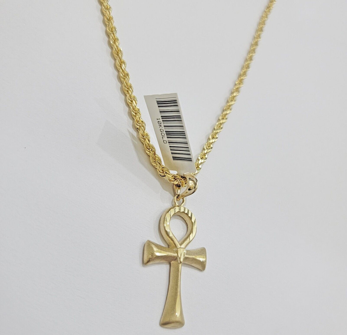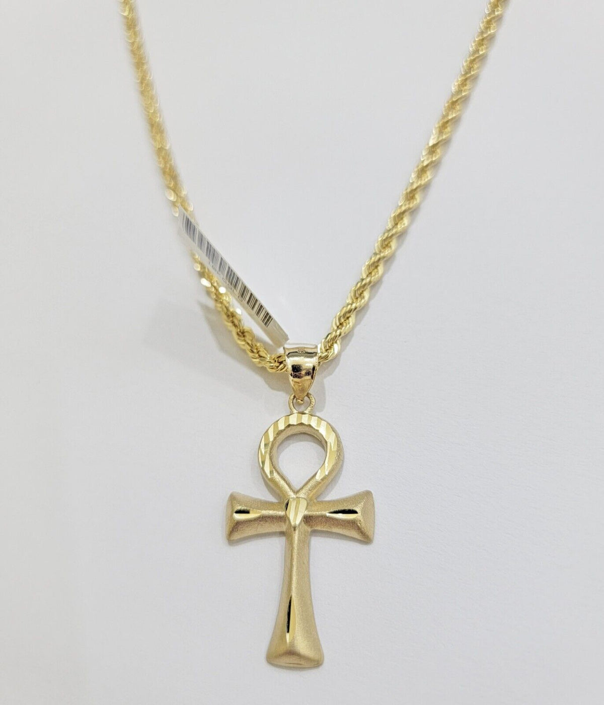 Genuine 10 k Yellow Gold 3mm 20" Rope Chain 3mm With Ankh Cross diamond cuts design as a SET. The length of the Chain are 20" with Ankh Cross 1.5 inches. If you are not happy with the way it looks or feels, we do offer 30 - Days FREE Return shipping. Contact us for more information.