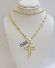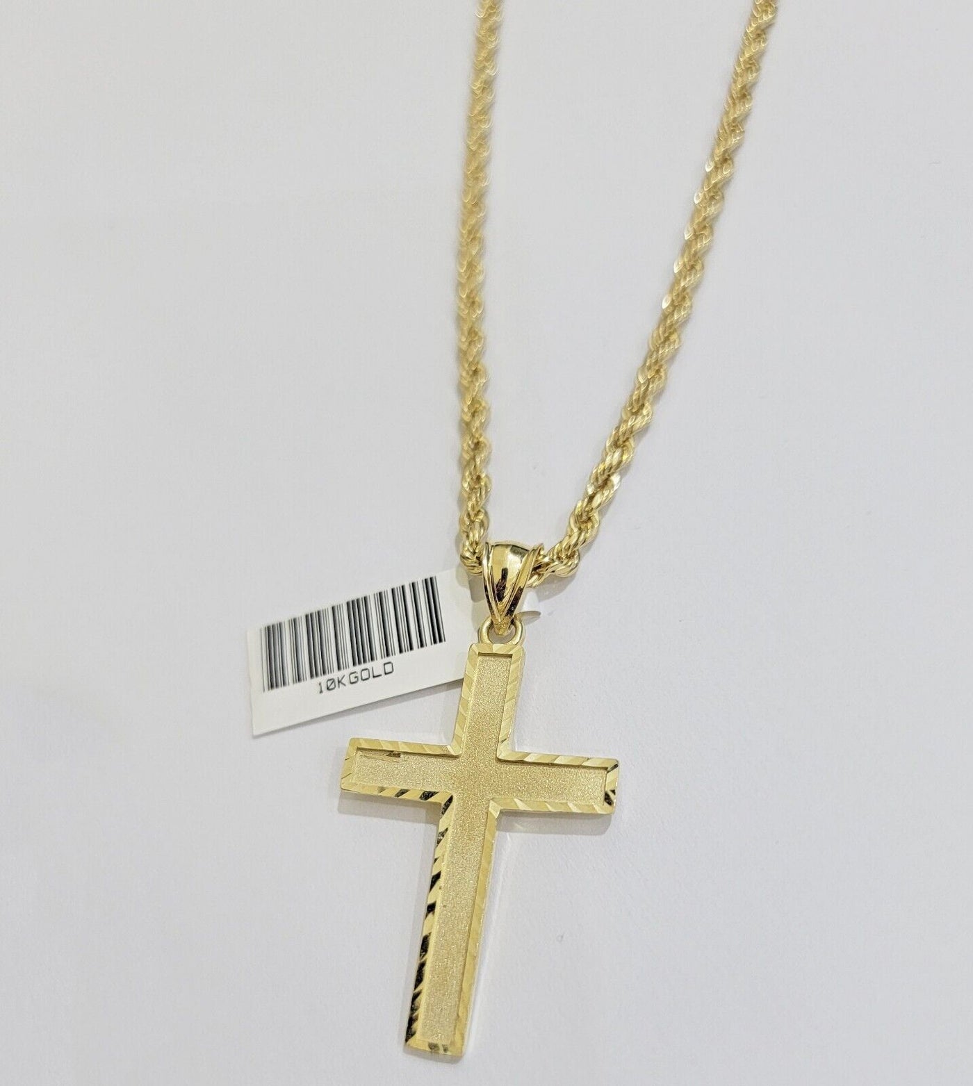 Genuine 10 k Yellow Gold Rope Chain 3mm With Cross diamond cuts design as a SET. The Various length of the Chain are 18"-28" with Jesus Crucifix Cross 1.75 inches. If you are not happy with the way it looks or feels, we do offer 30 - Days FREE Return shipping. Contact us for more information.
