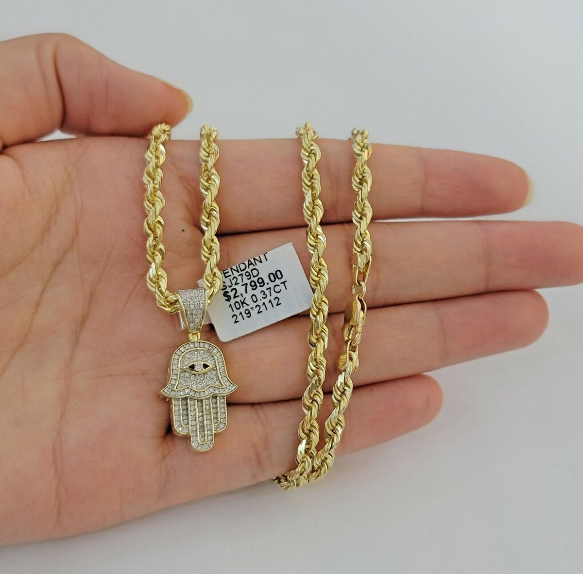 10k Gold Rope Chain Diamond Pendant Hamza Hand Charm Necklace SET REAL