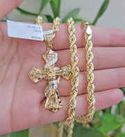 Genuine 10 k Yellow Gold Rope Chain 5mm With Jesus Crucifix Cross diamond cuts design. The Various length of the Chain are 18"-28" with Jesus Crucifix Cross 2 inches. The pendants are unique in design and considered durable too. The stones are cubic zirconia If you are not happy with the way it looks or feels, we do offer 30 - Days FREE Return shipping. Contact us for more information.