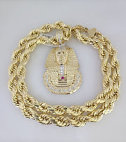 10k Hollow Rope Chain Pharaoh Head Charm Necklace Set 9mm 20"-30" Gold Real