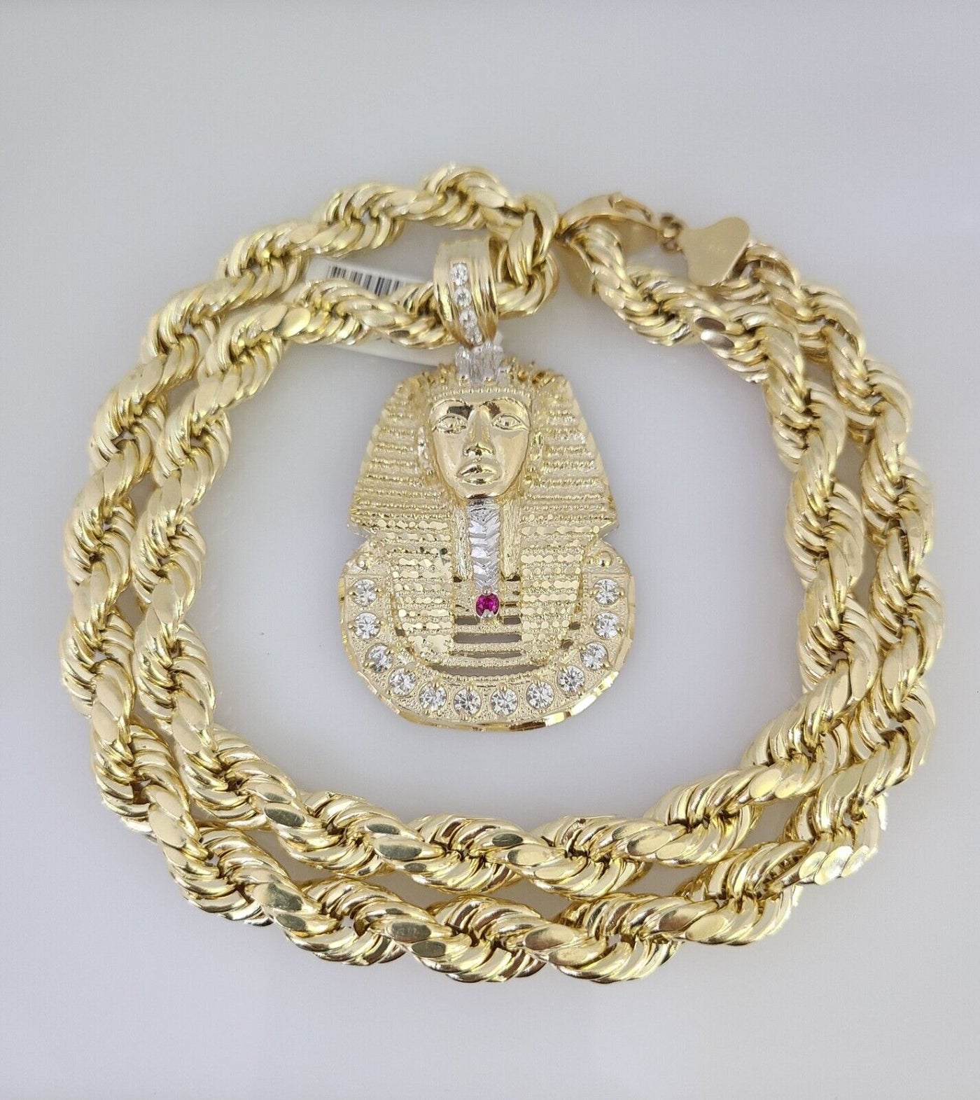10k Hollow Rope Chain Pharaoh Head Charm Necklace Set 9mm 20"-30" Gold Real - 20" Chain with Charm
