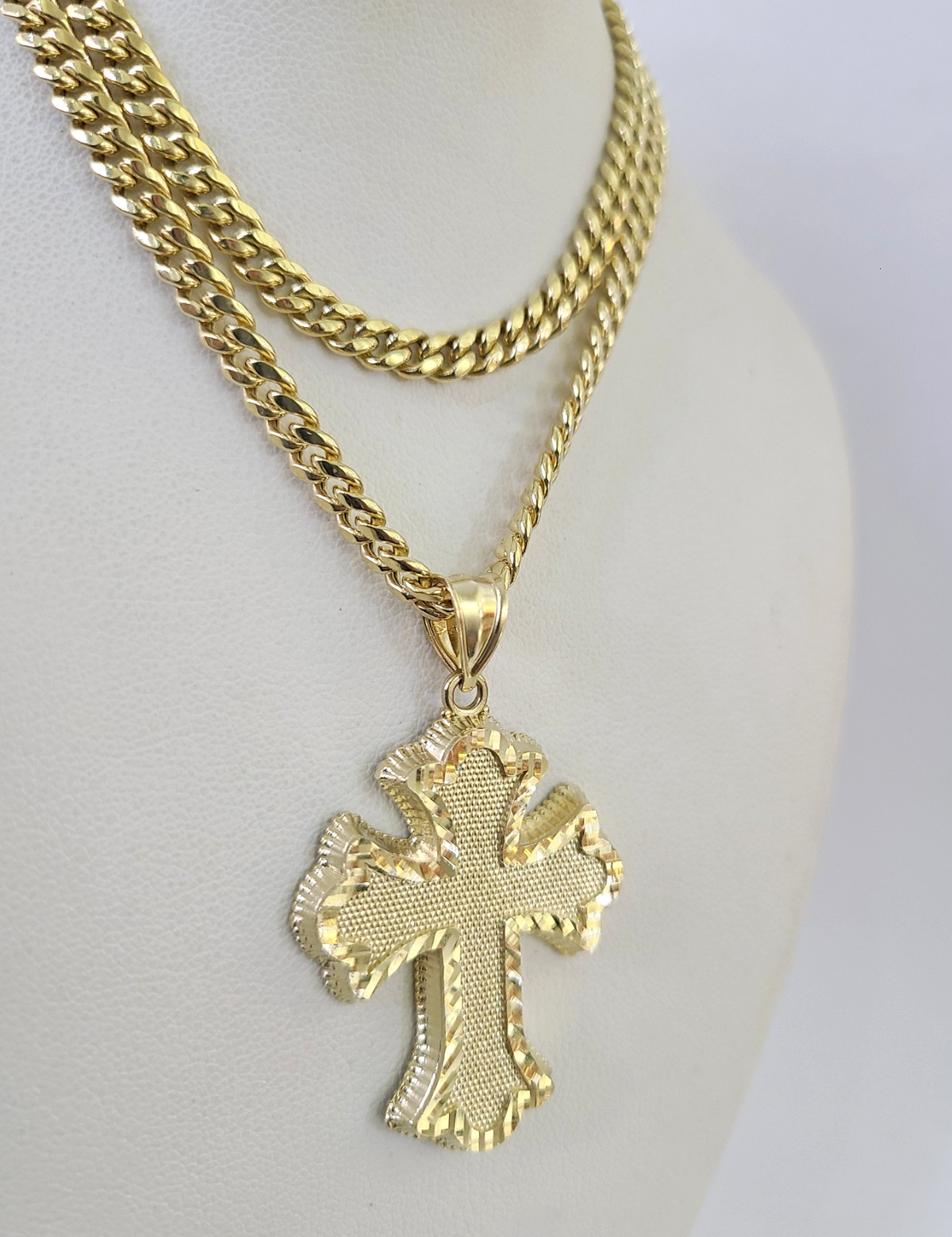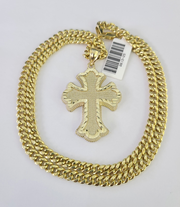 Is Presenting You with This Absolutely Stunning Real 10k Yellow Gold Miami Cuban Link Chain 5mm, 18 inch- 28 inches, Lobster Lock with a 10k Jesus Roman Cross Charm Pendant. These Beautiful chains and Pendant will not tarnish, discolor, or fade because they are Pure 10K Gold. We also have them in various another length and sizes. 20" A11B2 A4B9 Ask