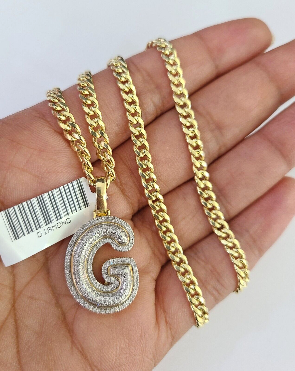 Is Presenting You with This Absolutely Stunning Real 10k Yellow Gold Miami Cuban Link Chain 4mm, 18 inch- 28 inches, Lobster Lock with a 10k G Initial Diamond Charm Pendant. The pendant is 1-1.5 inches long (approx.). These Beautiful chains and Pendant will not tarnish, discolor, or fade because they are Pure 10K Gold. 20"-A7B8 SJ371D