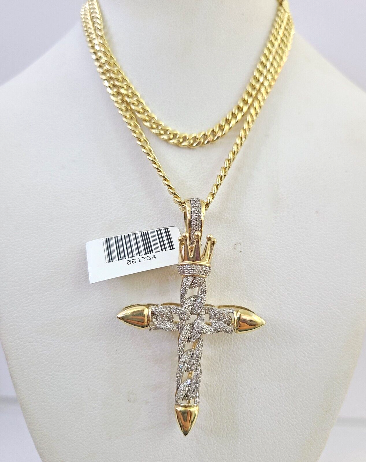 Is Presenting You with This Absolutely Stunning Real 10k Yellow Gold Miami Cuban Link Chain 4mm, 18 inch- 28 inches, Lobster Lock with a 10k Jesus Cross Diamond Charm Pendant. The pendant is 2-2.5 inches long (approx.). These Beautiful chains and Pendant will not tarnish, discolor, or fade because they are Pure 10K Gold. 20"-A7B8 WGD632RAC01