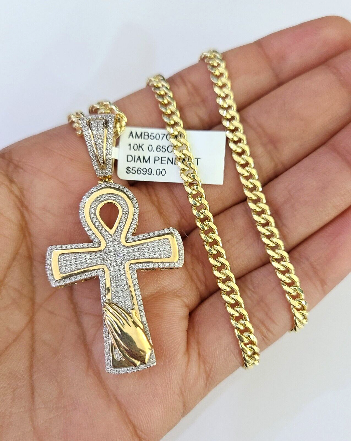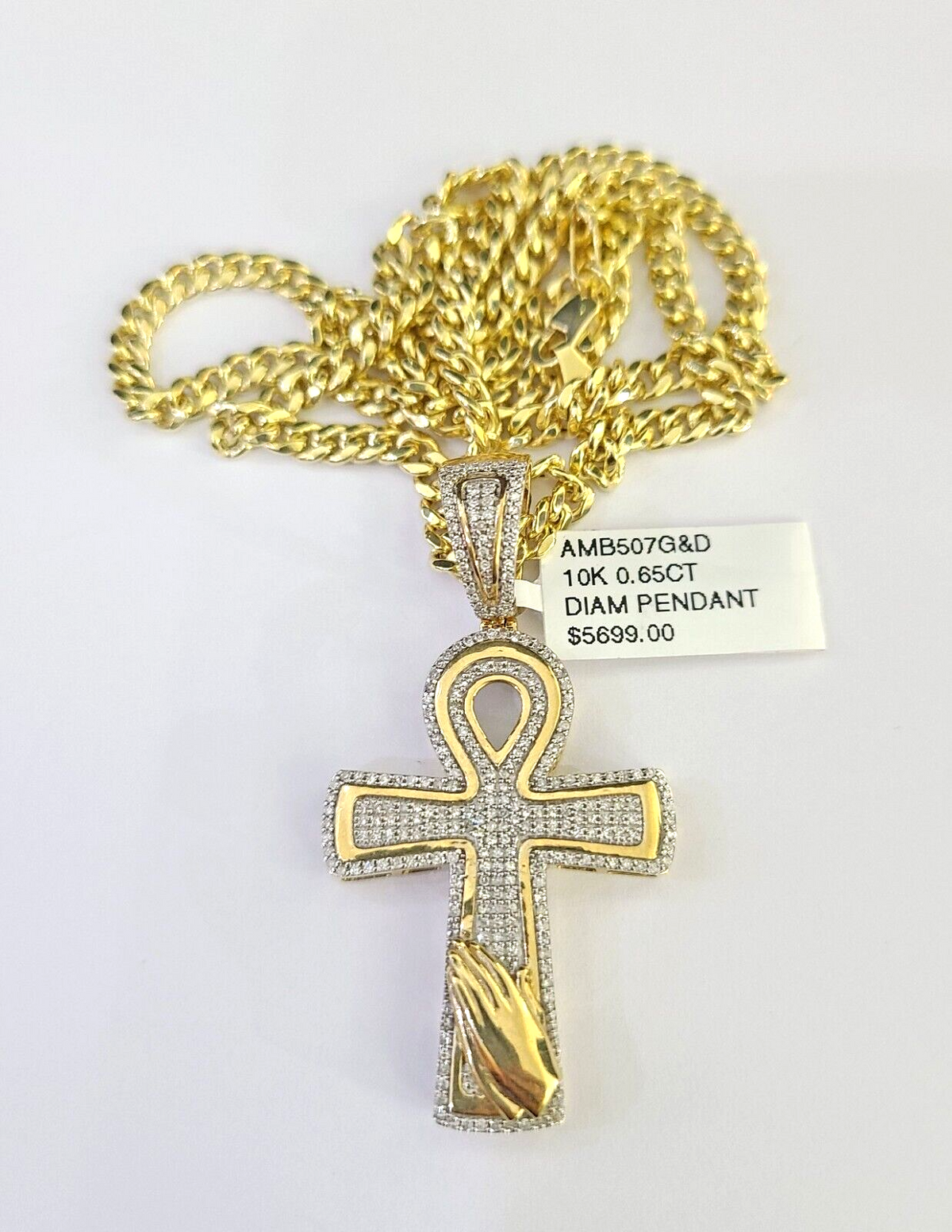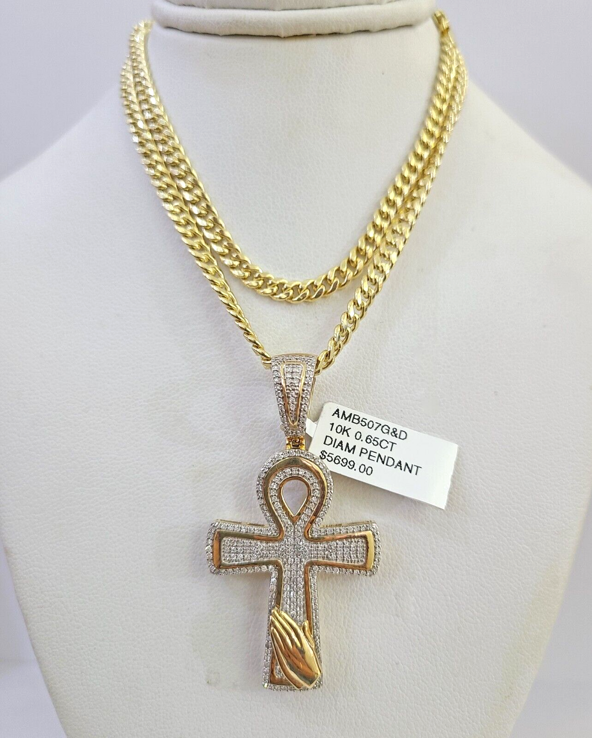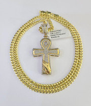 10k Miami Cuban Chain Diamond Jesus Cross Charm Set 4mm 18"-28" Necklace Gold
