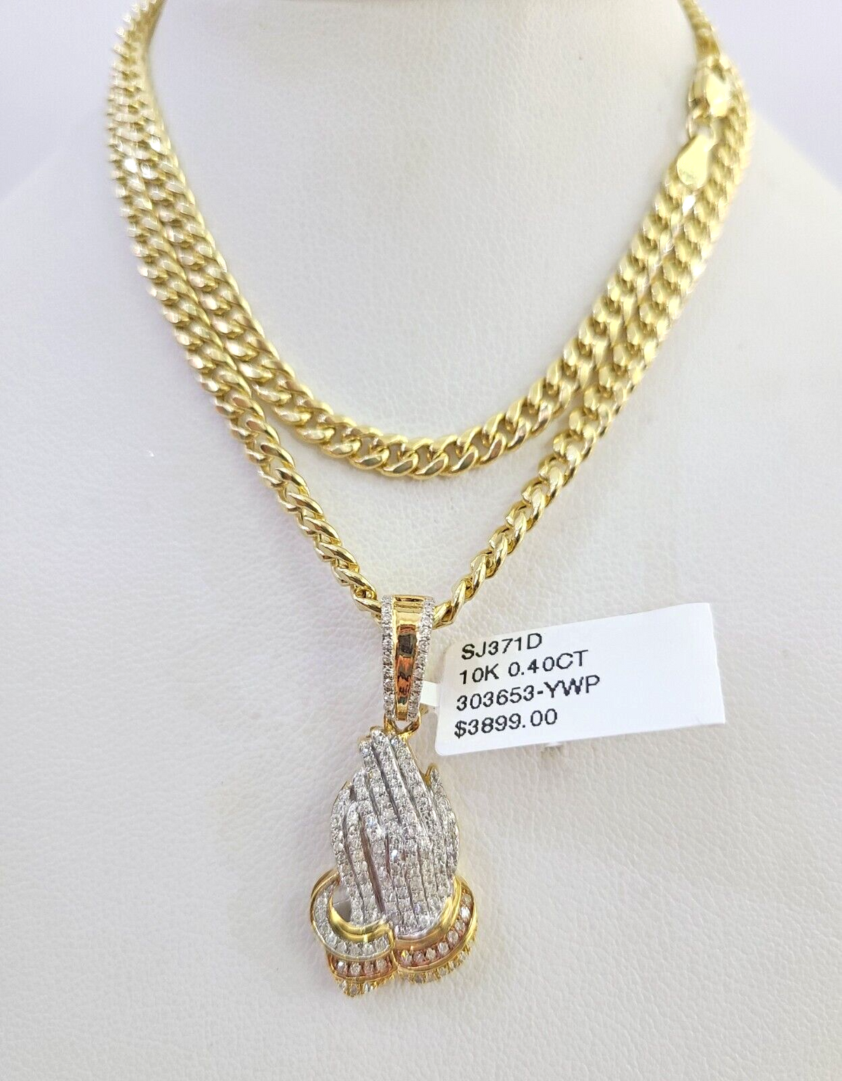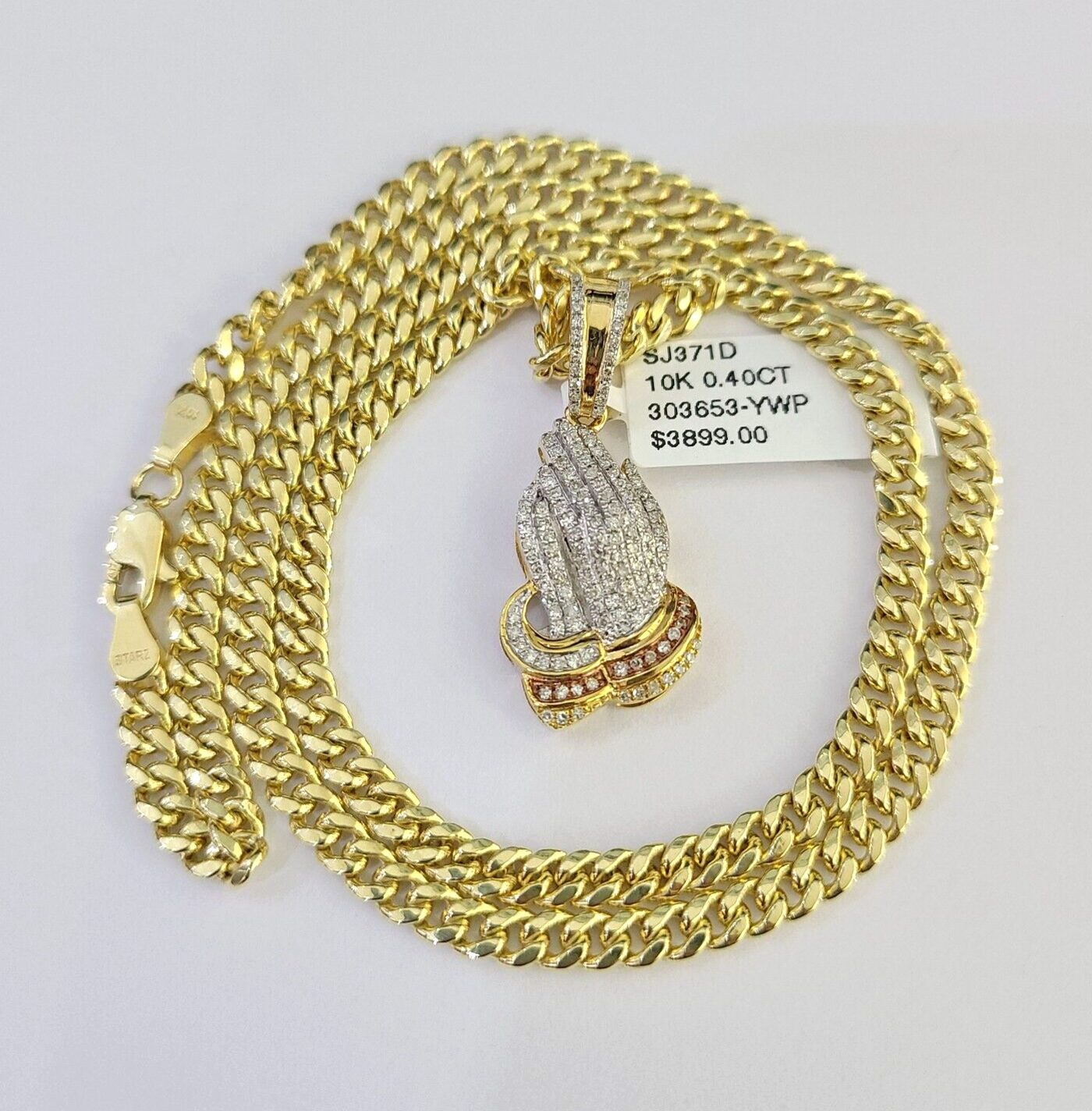 Is Presenting You with This Absolutely Stunning Real 10k Yellow Gold Miami Cuban Link Chain 4mm, 18 inch- 28 inches, Lobster Lock with a 10k Praying Hands Diamond Charm Pendant. The pendant is 1-1.5 inches long (approx.). These Beautiful chains and Pendant will not tarnish, discolor, or fade because they are Pure 10K Gold. 20"-A7B8 SJ371D