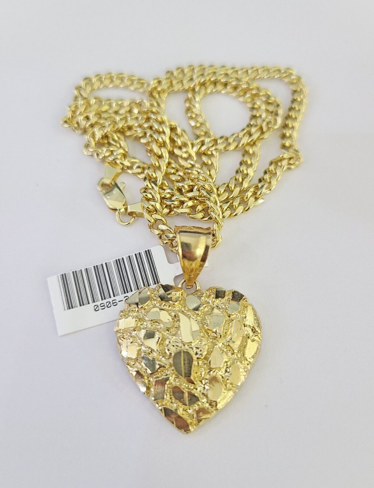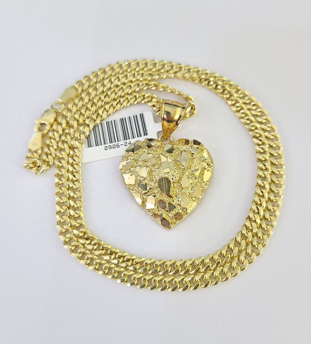 Is Presenting You with This Absolutely Stunning Real 10k Yellow Gold Miami Cuban Link Chain 4mm, 18 inch- 28 inches, Lobster Lock with a 10k Nugget Heart Charm Pendant. The pendant is 1-2 inches long (approx.). These Beautiful chains and Pendant will not tarnish, discolor, or fade because they are Pure 10K Gold. 20"-A7B8 A3B5 P12100