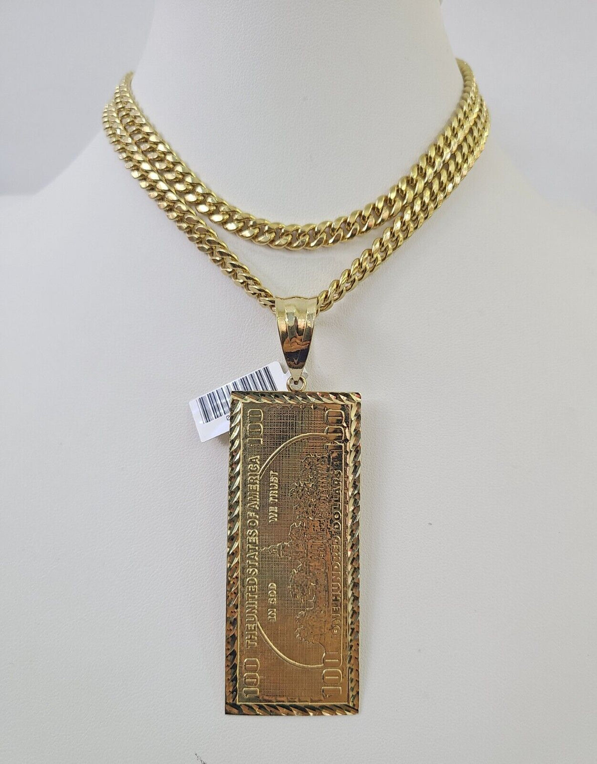 We present You with This Absolutely Stunning Real 10k Yellow Gold Miami Cuban Chain with 100 Dollar Money Bill Pendant Charm. It has a detailed cut with a very good finish. These Beautiful Chains and Pendants will not tarnish, discolor, or fade because they are Pure 10K Gold. Please feel free to contact us if you have any queries regarding the item. 26"-A23B9 A13B1